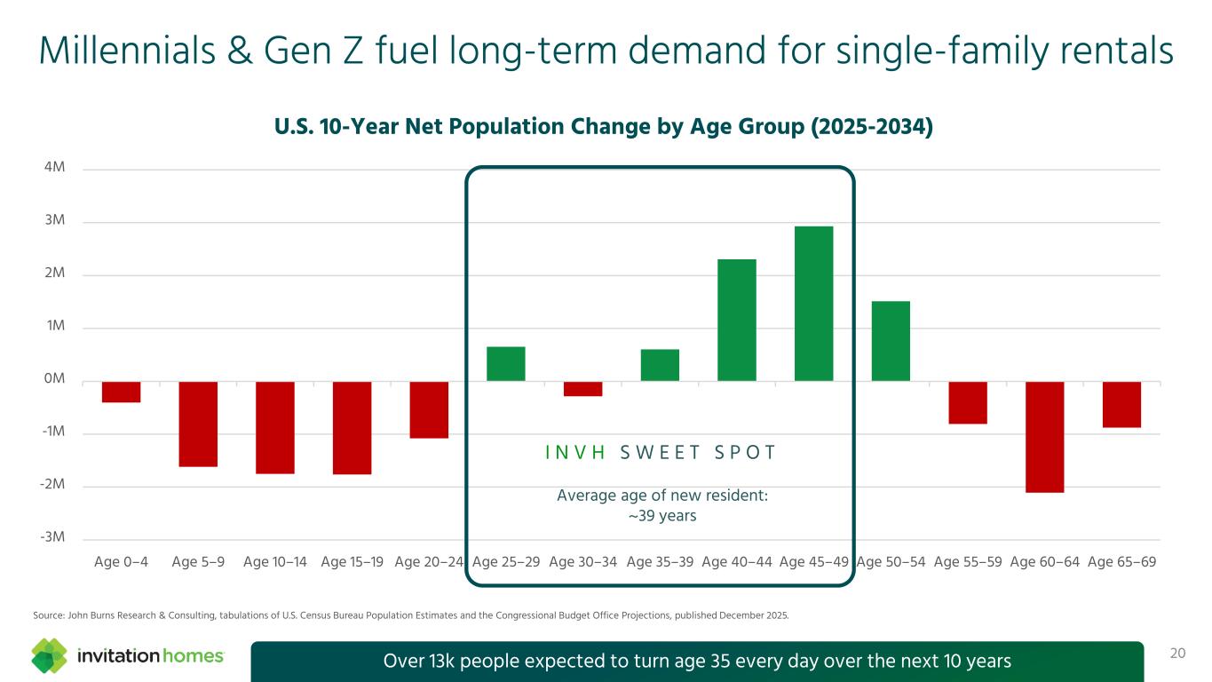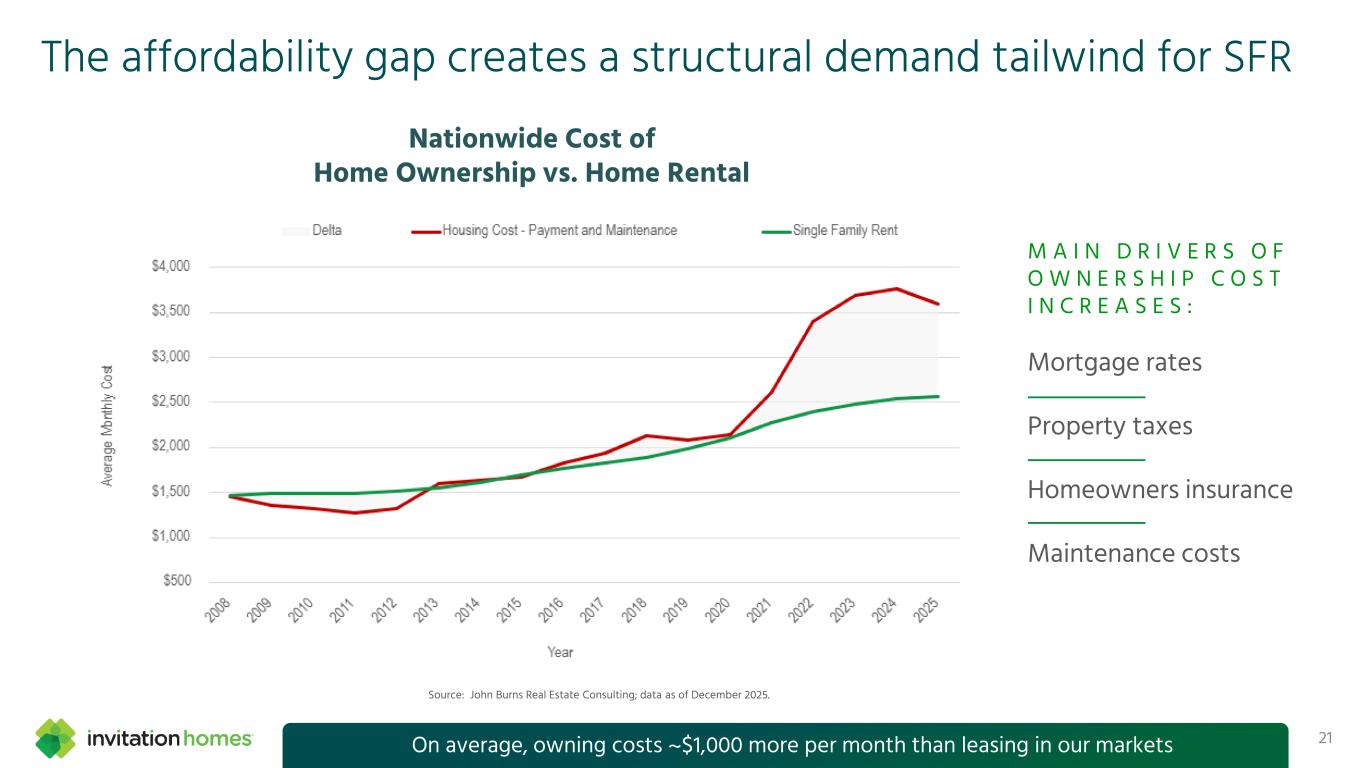Millennials & Gen Z fuel long-term demand for single-family rentals 20Over 13k people expected to turn age 35 every day over the next 10 years -3M -2M -1M 0M 1M 2M 3M 4M Age 0–4 Age 5–9 Age 10–14 Age 15–19 Age 20–24 Age 25–29 Age 30–34 Age 35–39 Age 40–44 Age 45–49 Age 50–54 Age 55–59 Age 60–64 Age 65–69 U.S. 10-Year Net Population Change by Age Group (2025-2034) I N V H S W E E T S P O T Average age of new resident: ~39 years Source: John Burns Research & Consulting, tabulations of U.S. Census Bureau Population Estimates and the Congressional Budget Office Projections, published December 2025.