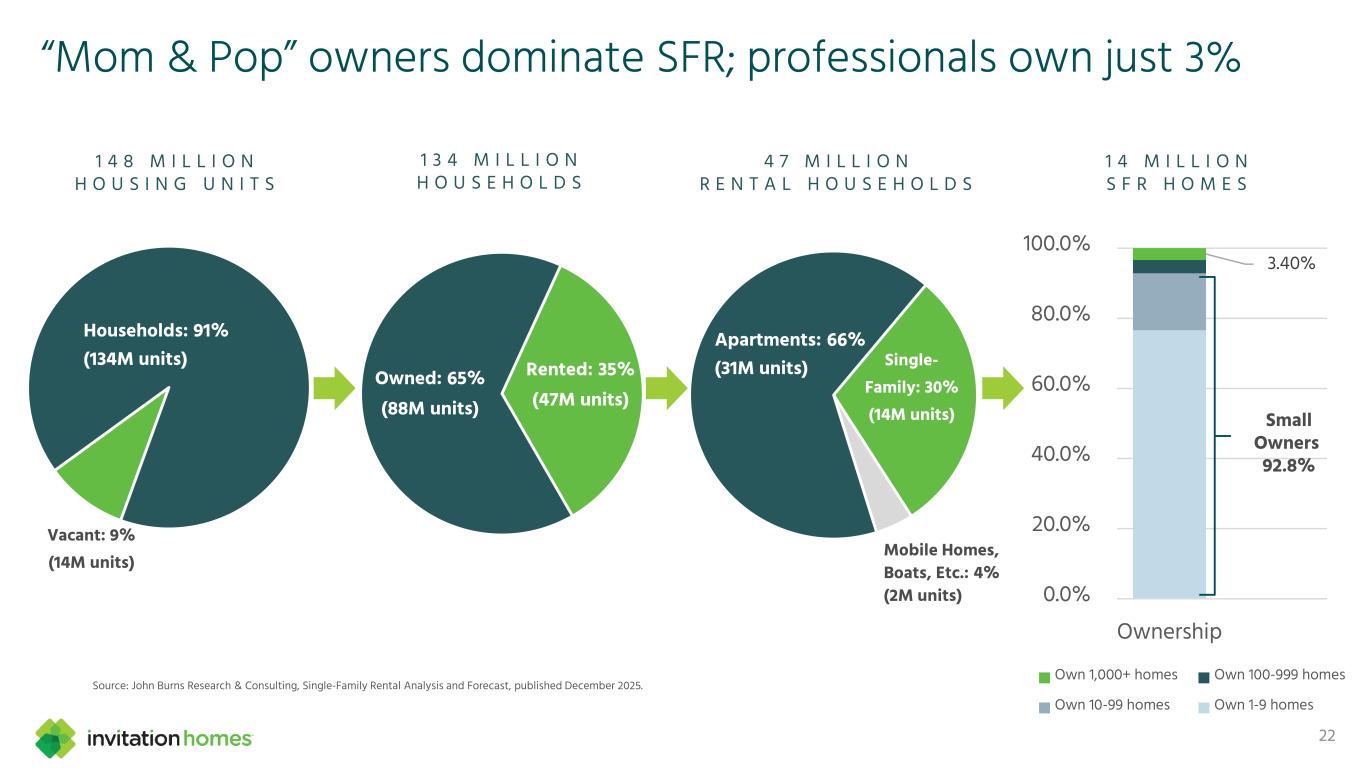 The affordability gap creates a structural demand tailwind for SFR 21 Nationwide Cost of Home Ownership vs. Home Rental Source: John Burns Real Estate Consulting; data as of December 2025. M A I N D R I V E R S O F O W N E R S H I P C O S T I N C R E A S E S : Mortgage rates Property taxes Homeowners insurance Maintenance costs On average, owning costs ~$1,000 more per month than leasing in our markets