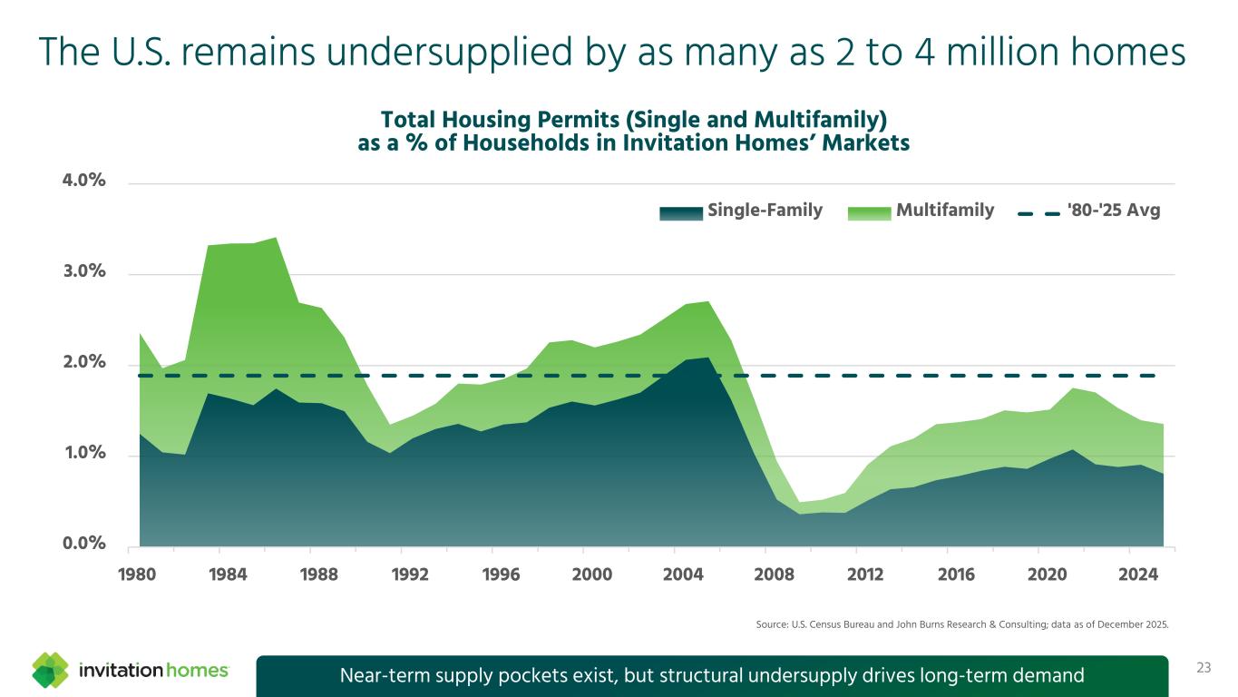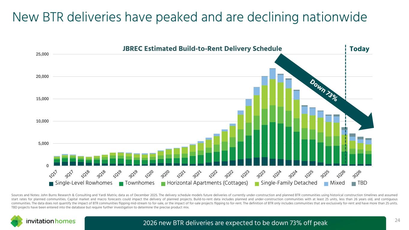 The U.S. remains undersupplied by as many as 2 to 4 million homes Total Housing Permits (Single and Multifamily) as a % of Households in Invitation Homes’ Markets 0.0% 1.0% 2.0% 3.0% 4.0% 1980 1984 1988 1992 1996 2000 2004 2008 2012 2016 2020 2024 Single-Family Multifamily '80-'25 Avg Source: U.S. Census Bureau and John Burns Research & Consulting; data as of December 2025. 23Near-term supply pockets exist, but structural undersupply drives long-term demand