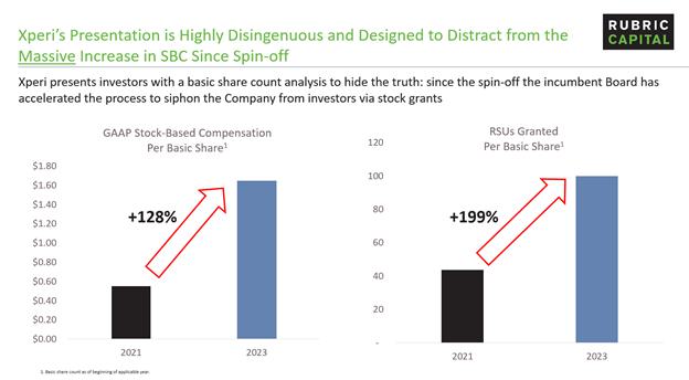 We focus on 2021, the last full year before Xperi’s spin-off, and 2023, the first full year following the spin-off, to present to you both GAAP stock-based compensation and RSU grants on a per share basis. Our doing so demonstrates just how dramatically the Xperi Board has accelerated dilution to stockholders. Due to the spin-off, Xperi’s share count today is 60% less than it was in 2021, but its stock-based compensation has increased on an absolute basis. Accordingly, stockholders lose and insiders reap the rewards, with almost 80% of those RSUs tied not to performance but to the passage of time. It is clear to us that Xperi is cultivating a culture of ‘rest and vest.’