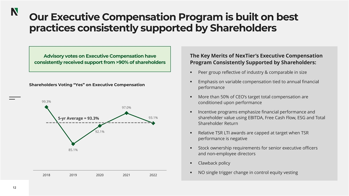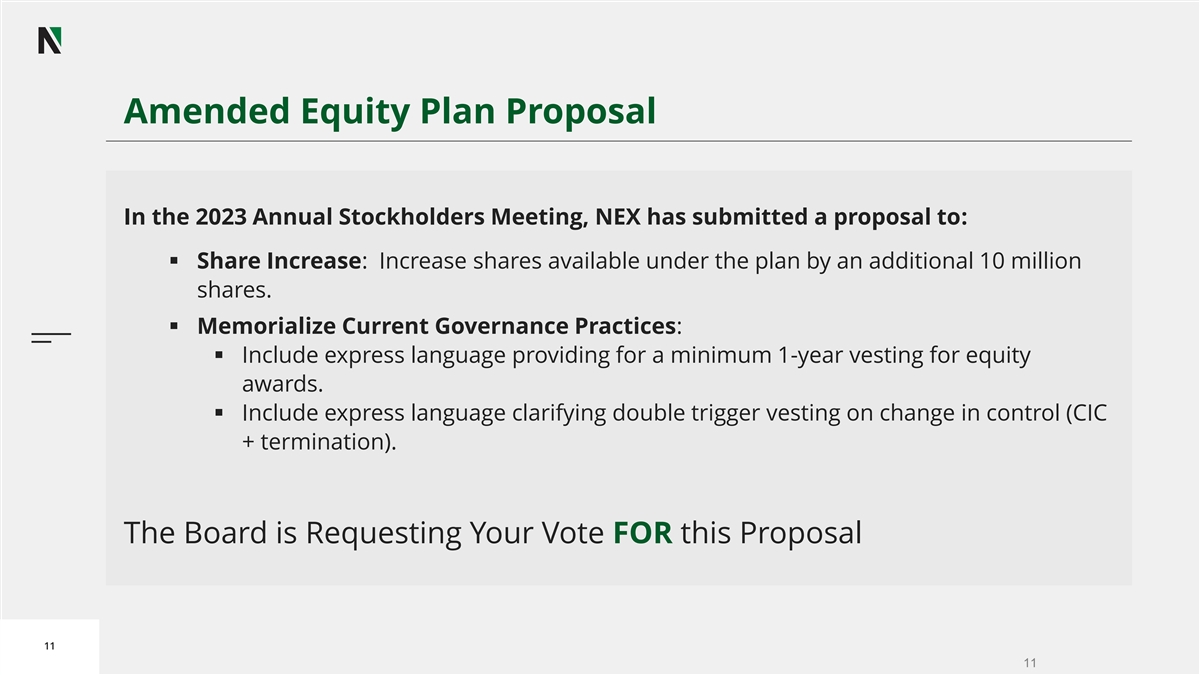 Amended Equity Plan Proposal In the 2023 Annual Stockholders Meeting, NEX has submitted a proposal to: ▪ Share Increase: Increase shares available under the plan by an additional 10 million shares. ▪ Memorialize Current Governance Practices: ▪ Include express language providing for a minimum 1-year vesting for equity awards. ▪ Include express language clarifying double trigger vesting on change in control (CIC + termination). The Board is Requesting Your Vote FOR this Proposal 11 11