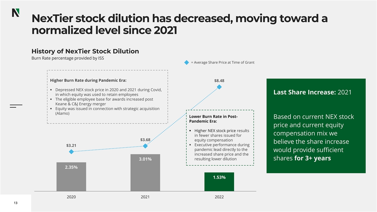 Our Executive Compensation Program is built on best practices consistently supported by Shareholders Advisory votes on Executive Compensation have The Key Merits of NexTier’s Executive Compensation consistently received support from >90% of shareholders Program Consistently Supported by Shareholders: ▪ Peer group reflective of industry & comparable in size ▪ Emphasis on variable compensation tied to annual financial Shareholders Voting “Yes” on Executive Compensation performance 105.00% ▪ More than 50% of CEO’s target total compensation are 99.3% conditioned upon performance 100.00% 97.0% ▪ Incentive programs emphasize financial performance and 93.1% 95.00% shareholder value using EBITDA, Free Cash Flow, ESG and Total 5-yr Average = 93.3% Shareholder Return 90.00% 92.1% ▪ Relative TSR LTI awards are capped at target when TSR performance is negative 85.00% ▪ Stock ownership requirements for senior executive officers 85.1% and non-employee directors 80.00% ▪ Clawback policy 75.00% ▪ NO single trigger change in control equity vesting 2018 2019 2020 2021 2022 12