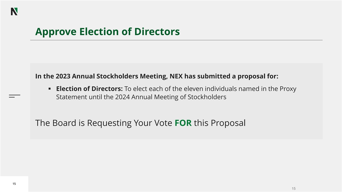 Approve Election of Directors In the 2023 Annual Stockholders Meeting, NEX has submitted a proposal for: ▪ Election of Directors: To elect each of the eleven individuals named in the Proxy Statement until the 2024 Annual Meeting of Stockholders The Board is Requesting Your Vote FOR this Proposal 15 15