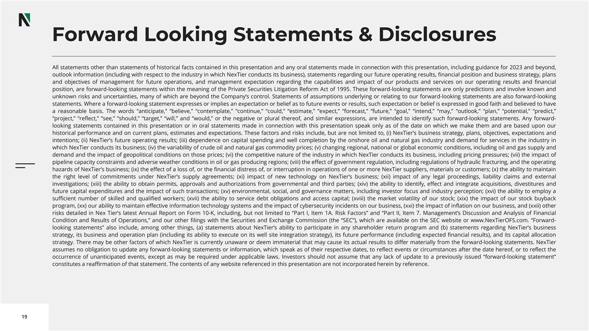 Forward Looking Statements & Disclosures All statements other than statements of historical facts contained in this presentation and any oral statements made in connection with this presentation, including guidance for 2023 and beyond, outlook information (including with respect to the industry in which NexTier conducts its business), statements regarding our future operating results, financial position and business strategy, plans and objectives of management for future operations, and management expectation regarding the capabilities and impact of our products and services on our operating results and financial position, are forward-looking statements within the meaning of the Private Securities Litigation Reform Act of 1995. These forward-looking statements are only predictions and involve known and unknown risks and uncertainties, many of which are beyond the Company’s control. Statements of assumptions underlying or relating to our forward-looking statements are also forward-looking statements. Where a forward-looking statement expresses or implies an expectation or belief as to future events or results, such expectation or belief is expressed in good faith and believed to have a reasonable basis. The words “anticipate,” “believe,” “contemplate,” “continue,” “could,” “estimate,” “expect,” “forecast,” “future,” “goal,” “intend,” “may,” “outlook,” “plan,” “potential,” “predict,” “project,” “reflect,” “see,” “should,” “target,” “will,” and “would,” or the negative or plural thereof, and similar expressions, are intended to identify such forward-looking statements. Any forward- looking statements contained in this presentation or in oral statements made in connection with this presentation speak only as of the date on which we make them and are based upon our historical performance and on current plans, estimates and expectations. These factors and risks include, but are not limited to, (i) NexTier’s business strategy, plans, objectives, expectations and intentions; (ii) NexTier’s future operating results; (iii) dependence on capital spending and well completion by the onshore oil and natural gas industry and demand for services in the industry in which NexTier conducts its business; (iv) the variability of crude oil and natural gas commodity prices; (v) changing regional, national or global economic conditions, including oil and gas supply and demand and the impact of geopolitical conditions on those prices; (vi) the competitive nature of the industry in which NexTier conducts its business, including pricing pressures; (vii) the impact of pipeline capacity constraints and adverse weather conditions in oil or gas producing regions; (viii) the effect of government regulation, including regulations of hydraulic fracturing, and the operating hazards of NexTier’s business; (ix) the effect of a loss of, or the financial distress of, or interruption in operations of one or more NexTier suppliers, materials or customers; (x) the ability to maintain the right level of commitments under NexTier’s supply agreements; (xi) impact of new technology on NexTier’s business; (xii) impact of any legal proceedings, liability claims and external investigations; (xiii) the ability to obtain permits, approvals and authorizations from governmental and third parties; (xiv) the ability to identify, effect and integrate acquisitions, divestitures and future capital expenditures and the impact of such transactions; (xv) environmental, social, and governance matters, including investor focus and industry perception; (xvi) the ability to employ a sufficient number of skilled and qualified workers; (xvii) the ability to service debt obligations and access capital; (xviii) the market volatility of our stock; (xix) the impact of our stock buyback program, (xx) our ability to maintain effective information technology systems and the impact of cybersecurity incidents on our business, (xxi) the impact of inflation on our business, and (xxii) other risks detailed in Nex Tier’s latest Annual Report on Form 10-K, including, but not limited to “Part I, Item 1A. Risk Factors” and “Part II, Item 7. Management’s Discussion and Analysis of Financial Condition and Results of Operations,” and our other filings with the Securities and Exchange Commission (the “SEC”), which are available on the SEC website or www.NexTierOFS.com. “Forward- looking statements” also include, among other things, (a) statements about NexTier’s ability to participate in any shareholder return program and (b) statements regarding NexTier’s business strategy, its business and operation plan (including its ability to execute on its well site integration strategy), its future performance (including expected financial results), and its capital allocation strategy. There may be other factors of which NexTier is currently unaware or deem immaterial that may cause its actual results to differ materially from the forward-looking statements. NexTier assumes no obligation to update any forward-looking statements or information, which speak as of their respective dates, to reflect events or circumstances after the date hereof, or to reflect the occurrence of unanticipated events, except as may be required under applicable laws. Investors should not assume that any lack of update to a previously issued “forward-looking statement” constitutes a reaffirmation of that statement. The contents of any website referenced in this presentation are not incorporated herein by reference. 19