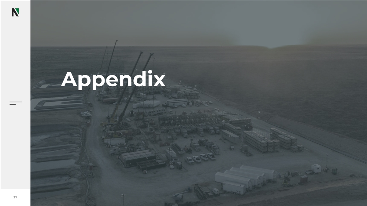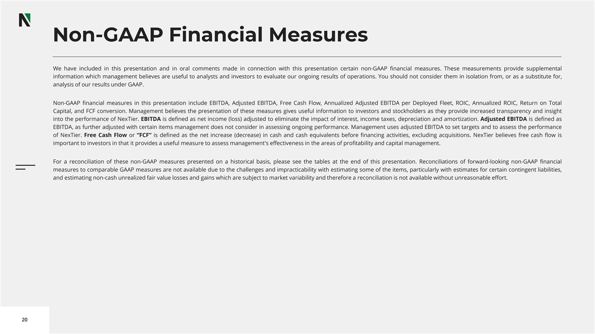 Non-GAAP Financial Measures We have included in this presentation and in oral comments made in connection with this presentation certain non-GAAP financial measures. These measurements provide supplemental information which management believes are useful to analysts and investors to evaluate our ongoing results of operations. You should not consider them in isolation from, or as a substitute for, analysis of our results under GAAP. Non-GAAP financial measures in this presentation include EBITDA, Adjusted EBITDA, Free Cash Flow, Annualized Adjusted EBITDA per Deployed Fleet, ROIC, Annualized ROIC, Return on Total Capital, and FCF conversion. Management believes the presentation of these measures gives useful information to investors and stockholders as they provide increased transparency and insight into the performance of NexTier. EBITDA is defined as net income (loss) adjusted to eliminate the impact of interest, income taxes, depreciation and amortization. Adjusted EBITDA is defined as EBITDA, as further adjusted with certain items management does not consider in assessing ongoing performance. Management uses adjusted EBITDA to set targets and to assess the performance of NexTier. Free Cash Flow or “FCF” is defined as the net increase (decrease) in cash and cash equivalents before financing activities, excluding acquisitions. NexTier believes free cash flow is important to investors in that it provides a useful measure to assess management's effectiveness in the areas of profitability and capital management. For a reconciliation of these non-GAAP measures presented on a historical basis, please see the tables at the end of this presentation. Reconciliations of forward-looking non-GAAP financial measures to comparable GAAP measures are not available due to the challenges and impracticability with estimating some of the items, particularly with estimates for certain contingent liabilities, and estimating non-cash unrealized fair value losses and gains which are subject to market variability and therefore a reconciliation is not available without unreasonable effort. 20
