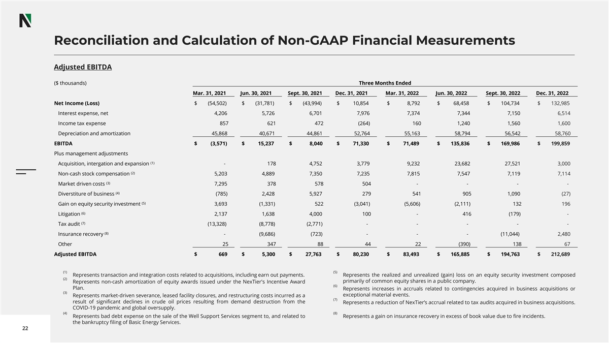 Reconciliation and Calculation of Non-GAAP Financial Measurements Adjusted EBITDA ($ thousands) Three Months Ended Mar. 31, 2021 Jun. 30, 2021 Sept. 30, 2021 Dec. 31, 2021 Mar. 31, 2022 Jun. 30, 2022 Sept. 30, 2022 Dec. 31, 2022 Net Income (Loss) $ (54,502) $ (31,781) $ (43,994) $ 10,854 $ 8,792 $ 68,458 $ 104,734 $ 132,985 Interest expense, net 4,206 5,726 6,701 7,976 7,374 7,344 7,150 6,514 Income tax expense 857 621 472 (264) 160 1,240 1,560 1,600 Depreciation and amortization 45,868 40,671 44,861 52,764 55,163 58,794 56,542 58,760 EBITDA $ (3,571) $ 15,237 $ 8,040 $ 71,330 $ 71,489 $ 135,836 $ 169,986 $ 199,859 Plus management adjustments (1) Acquisition, intergation and expansion - 178 4,752 3,779 9,232 23,682 27,521 3,000 (2) Non-cash stock compensation 5,203 4,889 7,350 7,235 7,815 7,547 7,119 7,114 (3) Market driven costs 7,295 378 578 504 - - - - (4) Diverstiture of business (785) 2,428 5,927 279 541 905 1,090 (27) (5) Gain on equity security investment 3,693 (1,331) 522 (3,041) (5,606) (2,111) 132 196 (6) Litigation 2,137 1,638 4,000 100 - 416 (179) - (7) Tax audit (13,328) (8,778) (2,771) - - - - - (8) Insurance recovery - (9,686) (723) - - - (11,044) 2,480 Other 25 347 88 44 22 (390) 138 67 Adjusted EBITDA $ 669 $ 5,300 $ 27,763 $ 80,230 $ 83,493 $ 165,885 $ 194,763 $ 212,689 (1) (5) Represents transaction and integration costs related to acquisitions, including earn out payments. Represents the realized and unrealized (gain) loss on an equity security investment composed (2) primarily of common equity shares in a public company. Represents non-cash amortization of equity awards issued under the NexTier's Incentive Award (6) Plan. Represents increases in accruals related to contingencies acquired in business acquisitions or (3) exceptional material events. Represents market-driven severance, leased facility closures, and restructuring costs incurred as a (7) result of significant declines in crude oil prices resulting from demand destruction from the Represents a reduction of NexTier’s accrual related to tax audits acquired in business acquisitions. COVID-19 pandemic and global oversupply. (4) (8) Represents bad debt expense on the sale of the Well Support Services segment to, and related to Represents a gain on insurance recovery in excess of book value due to fire incidents. the bankruptcy filing of Basic Energy Services. 22