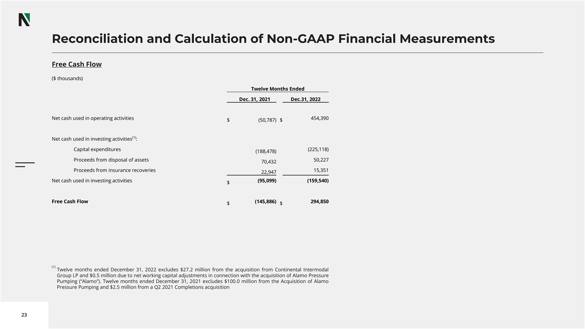 Reconciliation and Calculation of Non-GAAP Financial Measurements Free Cash Flow ($ thousands) Twelve Months Ended Dec. 31, 2021 Dec.31, 2022 Net cash used in operating activities 454,390 $ (50,787) $ (1) Net cash used in investing activities : Capital expenditures (225,118) (188,478) Proceeds from disposal of assets 50,227 70,432 Proceeds from insurance recoveries 15,351 22,947 Net cash used in investing activities (95,099) (159,540) $ Free Cash Flow (145,886) 294,850 $ $ (1) Twelve months ended December 31, 2022 excludes $27.2 million from the acquisition from Continental Intermodal Group LP and $0.5 million due to net working capital adjustments in connection with the acquisition of Alamo Pressure Pumping (“Alamo”). Twelve months ended December 31, 2021 excludes $100.0 million from the Acquisition of Alamo Pressure Pumping and $2.5 million from a Q2 2021 Completions acquisition 23