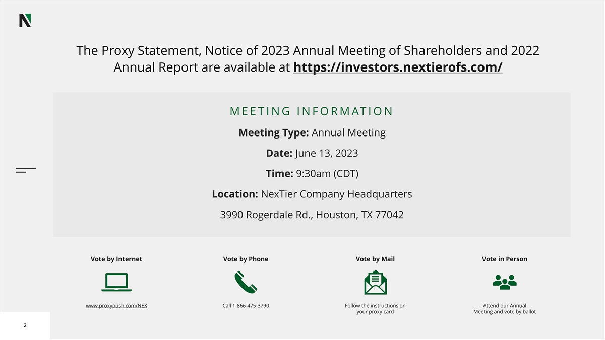 The Proxy Statement, Notice of 2023 Annual Meeting of Shareholders and 2022 Annual Report are available at https://investors.nextierofs.com/ M E E T I N G I N F O R M AT I O N Meeting Type: Annual Meeting Date: June 13, 2023 Time: 9:30am (CDT) Location: NexTier Company Headquarters 3990 Rogerdale Rd., Houston, TX 77042 Vote by Internet Vote by Phone Vote by Mail Vote in Person www.proxypush.com/NEX Call 1-866-475-3790 Follow the instructions on Attend our Annual your proxy card Meeting and vote by ballot 2