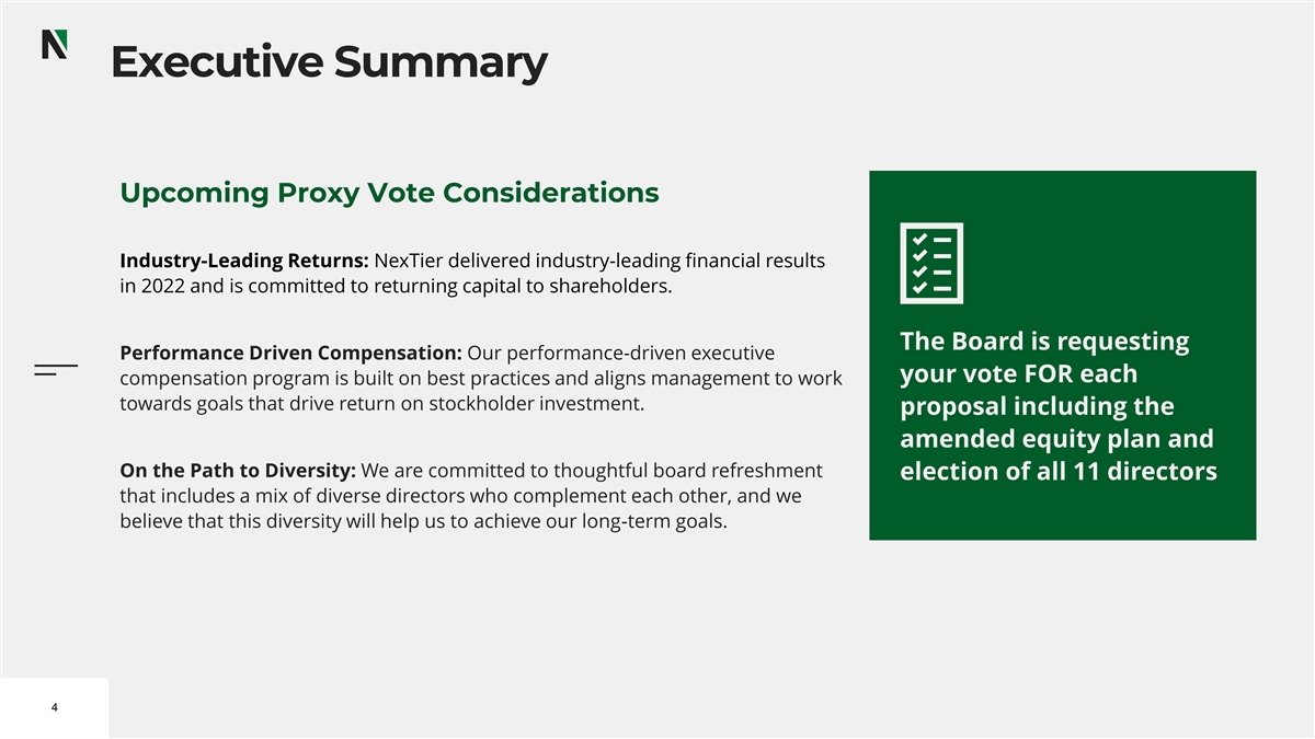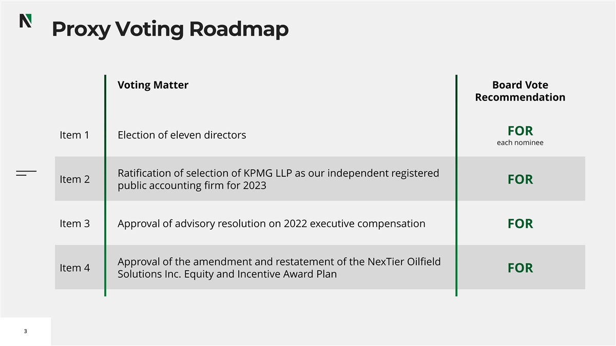 Proxy Voting Roadmap Voting Matter Board Vote Recommendation FOR Item 1 Election of eleven directors each nominee Ratification of selection of KPMG LLP as our independent registered Item 2 FOR public accounting firm for 2023 Item 3 Approval of advisory resolution on 2022 executive compensation FOR Approval of the amendment and restatement of the NexTier Oilfield Item 4 FOR Solutions Inc. Equity and Incentive Award Plan 3