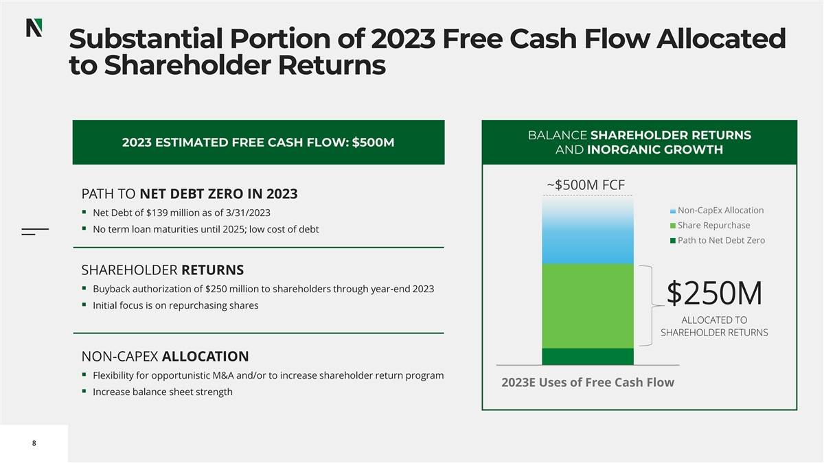2022 Shareholder Returns Outpaced Sector 1 2022 Total Shareholder Returns NexTier vs. OFS Peers NexTier significantly outperformed 180.0% the OFS market in delivering total 160% 160.0% shareholder returns in 2022. ▪ Delivered 160% total shareholder 140.0% return 120.0% th ▪ 15 best performing stock in both the 102% 97% Russell 2000 and Russell 3000 in 2022 100.0% ▪ Added to the S&P Small Cap 600 (March 80.0% 2023) 66% .OSX Index = 59% 60.0% ▪ Significantly outperformed the PHLX Oil Service Sector Index (.OSX) 39% 40.0% 28% ▪ Significantly outperformed similar-sized peers Liberty Energy (LBRT) and ProFrac 20.0% (ACDC) 0.0% 2 NEX PTEN RES LBRT ACDC PUMP (1) Includes share price appreciation and dividends from market close on December 31, 2021 to December 31, 2022. 7 (2) ACDC only includes returns from IPO on May 13, 2022 to December 31, 2022.