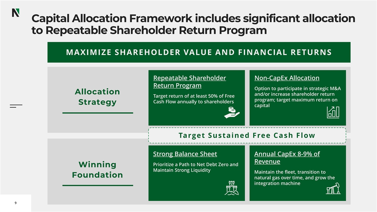 Capital Allocation Framework includes significant allocation to Repeatable Shareholder Return Program MAXIMIZE SHAREHOLDER VALUE AND FINANCIAL RETURNS Repeatable Shareholder Non-CapEx Allocation Return Program Option to participate in strategic M&A Allocation and/or increase shareholder return Target return of at least 50% of Free program; target maximum return on Cash Flow annually to shareholders Strategy capital Target Sustained Free Cash Flow Strong Balance Sheet Annual CapEx 8-9% of Revenue Prioritize a Path to Net Debt Zero and Winning Maintain Strong Liquidity Maintain the fleet, transition to Foundation natural gas over time, and grow the integration machine 9