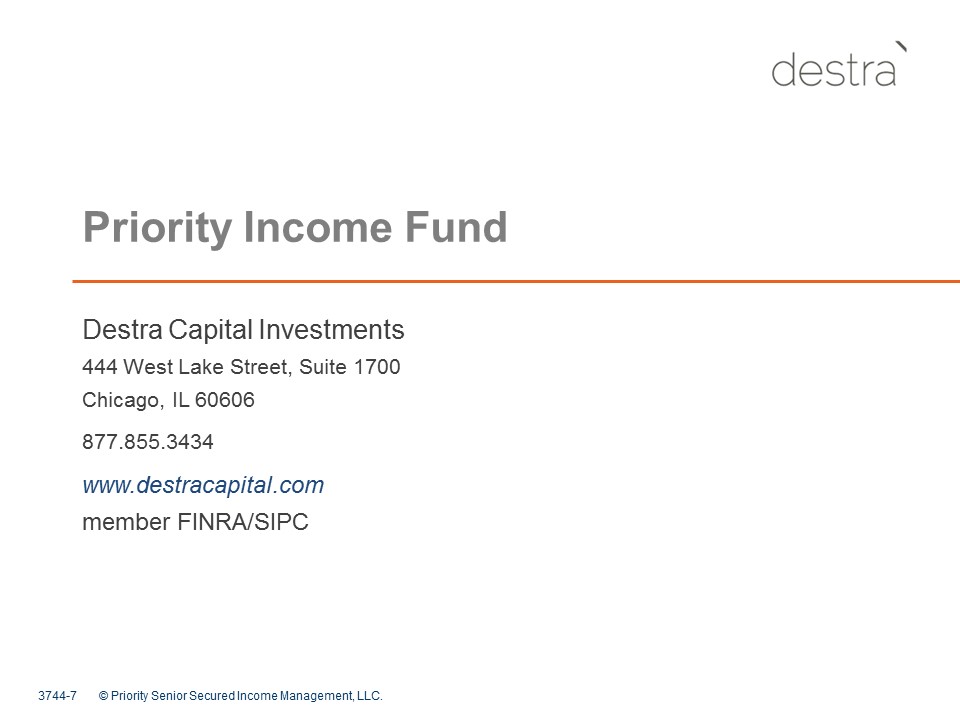 3744 - 7 © Priority Senior Secured Income Management, LLC. Destra Capital Investments 444 West Lake Street, Suite 1700 Chicago, IL 60606 877.855.3434 www.destracapital.com member FINRA/SIPC Priority Income Fund