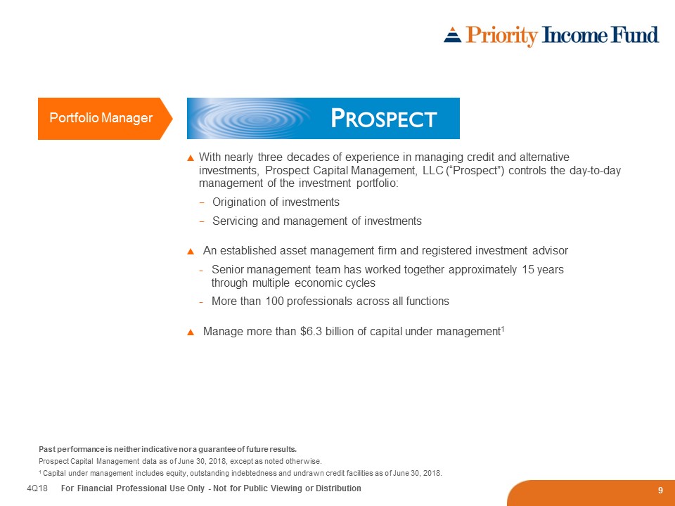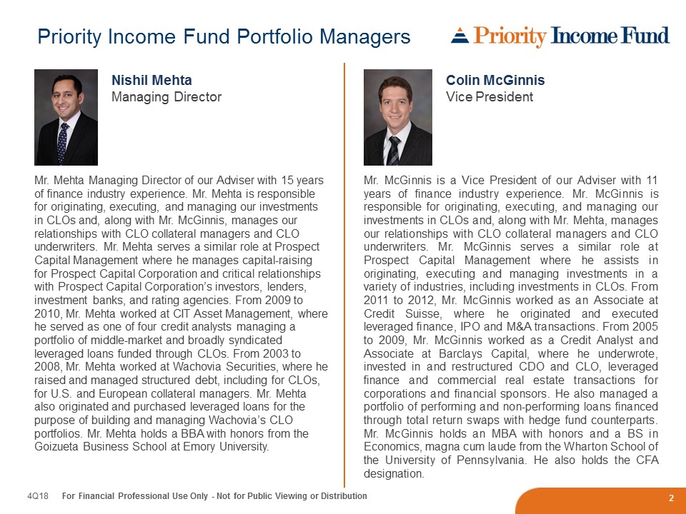 2 4Q18 For Financial Professional Use Only - Not for Public Viewing or Distribution Priority Income Fund Portfolio Managers Mr. Mehta Managing Director of our Adviser with 15 years of finance industry experience. Mr. Mehta is responsible for originating, executing, and managing our investments in CLOs and, along with Mr. McGinnis, manages our relationships with CLO collateral managers and CLO underwriters. Mr. Mehta serves a similar role at Prospect Capital Management where he manages capital - raising for Prospect Capital Corporation and critical relationships with Prospect Capital Corporation’s investors, lenders, investment banks, and rating agencies. From 2009 to 2010, Mr. Mehta worked at CIT Asset Management, where he served as one of four credit analysts managing a portfolio of middle - market and broadly syndicated leveraged loans funded through CLOs. From 2003 to 2008, Mr. Mehta worked at Wachovia Securities, where he raised and managed structured debt, including for CLOs, for U.S. and European collateral managers. Mr. Mehta also originated and purchased leveraged loans for the purpose of building and managing Wachovia’s CLO portfolios. Mr. Mehta holds a BBA with honors from the Goizueta Business School at Emory University. Mr . McGinnis is a Vice President of our Adviser with 11 years of finance industry experience . Mr . McGinnis is responsible for originating, executing, and managing our investments in CLOs and, along with Mr . Mehta, manages our relationships with CLO collateral managers and CLO underwriters . Mr . McGinnis serves a similar role at Prospect Capital Management where he assists in originating, executing and managing investments in a variety of industries, including investments in CLOs . From 2011 to 2012 , Mr . McGinnis worked as an Associate at Credit Suisse, where he originated and executed leveraged finance, IPO and M&A transactions . From 2005 to 2009 , Mr . McGinnis worked as a Credit Analyst and Associate at Barclays Capital, where he underwrote, invested in and restructured CDO and CLO, leveraged finance and commercial real estate transactions for corporations and financial sponsors . He also managed a portfolio of performing and non - performing loans financed through total return swaps with hedge fund counterparts . Mr . McGinnis holds an MBA with honors and a BS in Economics, magna cum laude from the Wharton School of the University of Pennsylvania . He also holds the CFA designation . Nishil Mehta Managing Director Colin McGinnis Vice President