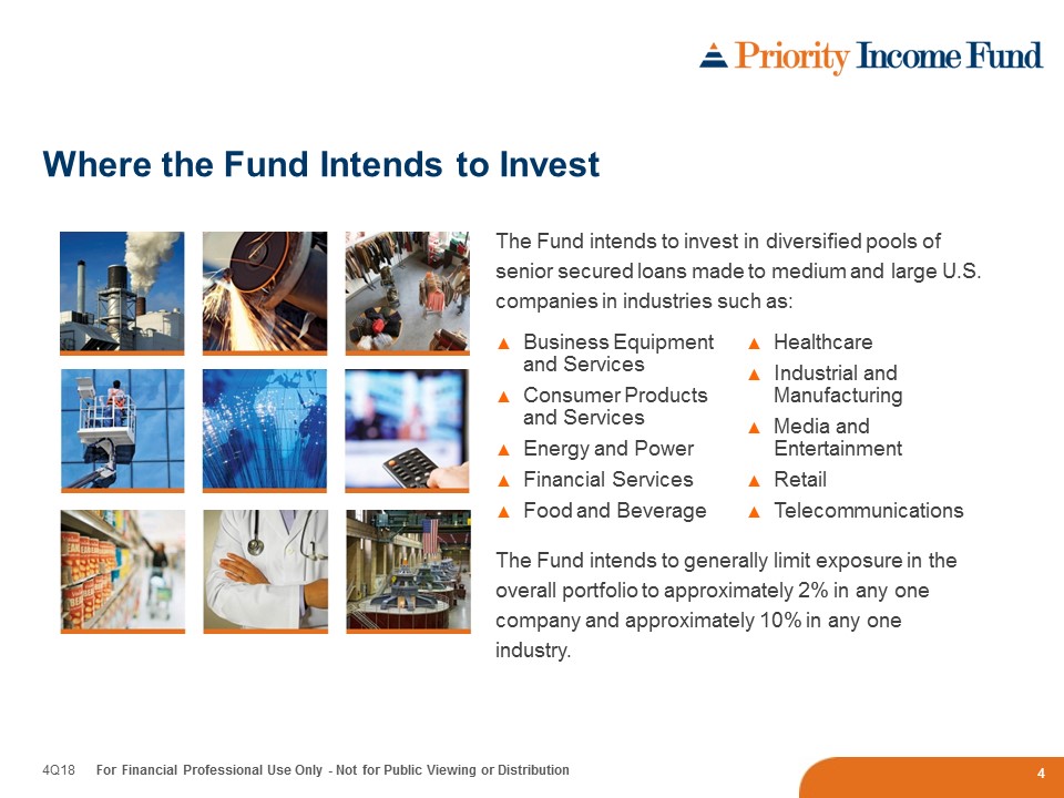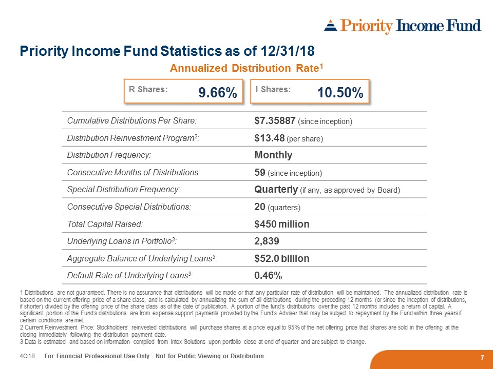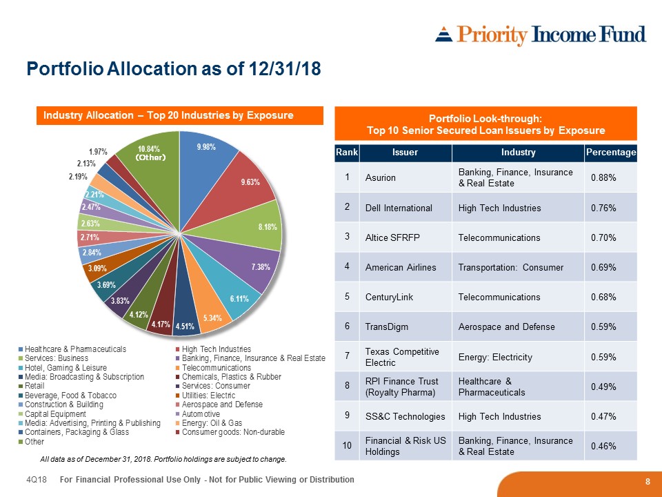 7 4Q18 For Financial Professional Use Only - Not for Public Viewing or Distribution Priority Income Fund Statistics as of 12/31/18 Cumulative Distributions Per Share: $7.35887 (since inception) Distribution Reinvestment Program 2 : $13.48 (per share) Distribution Frequency: Monthly Consecutive Months of Distributions: 59 (since inception) Special Distribution Frequency: Quarterly (if any, as approved by Board) Consecutive Special Distributions: 20 (quarters) Total Capital Raised: $450 million Underlying Loans in Portfolio 3 : 2,839 Aggregate Balance of Underlying Loans 3 : $52.0 billion Default Rate of Underlying Loans 3 : 0.46% Annualized Distribution Rate 1 R Shares: 9.66% I Shares: 10.50% 1 Distributions are not guaranteed. There is no assurance that distributions will be made or that any particular rate of dist rib ution will be maintained. The annualized distribution rate is based on the current offering price of a share class, and is calculated by annualizing the sum of all distributions during th e p receding 12 months (or since the inception of distributions, if shorter) divided by the offering price of the share class as of the date of publication. A portion of the fund’s distribut ion s over the past 12 months includes a return of capital. A significant portion of the Fund’s distributions are from expense support payments provided by the Fund’s Adviser that may be sub ject to repayment by the Fund within three years if certain conditions are met. 2 Current Reinvestment Price: Stockholders’ reinvested distributions will purchase shares at a price equal to 95% of the net off ering price that shares are sold in the offering at the closing immediately following the distribution payment date. 3 Data is estimated and based on information compiled from Intex Solutions upon portfolio close at end of quarter and are sub jec t to change.