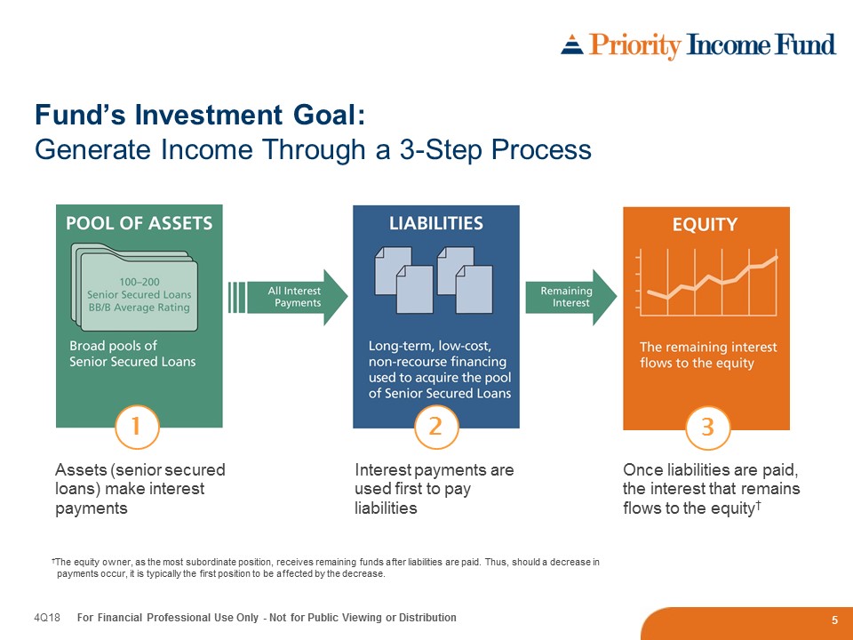 4 4Q18 For Financial Professional Use Only - Not for Public Viewing or Distribution The Fund intends to invest in diversified pools of senior secured loans made to medium and large U.S. companies in industries such as: The Fund intends to generally limit exposure in the overall portfolio to approximately 2% in any one company and approximately 10% in any one industry. ▲ Business Equipment and Services ▲ Consumer Products and Services ▲ Energy and Power ▲ Financial Services ▲ Food and Beverage ▲ Healthcare ▲ Industrial and Manufacturing ▲ Media and Entertainment ▲ Retail ▲ Telecommunications Where the Fund Intends to Invest