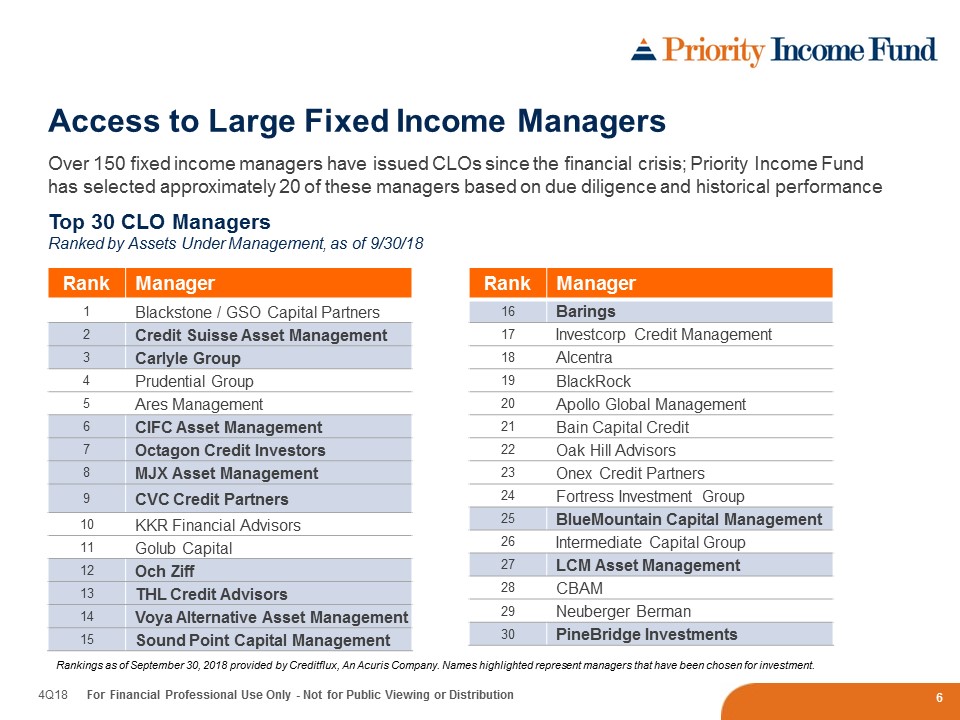 5 4Q18 For Financial Professional Use Only - Not for Public Viewing or Distribution † The equity owner, as the most subordinate position, receives remaining funds after liabilities are paid. Thus, should a decre ase in payments occur, it is typically the first position to be affected by the decrease. † Assets (senior secured loans) make interest payments 1 Interest payments are used first to pay liabilities 2 Once liabilities are paid, the interest that remains flows to the equity † 3 Fund’s Investment Goal: Generate Income Through a 3 - Step Process