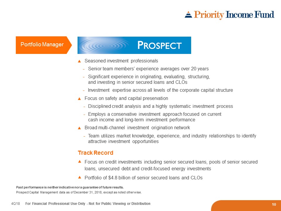 9 4Q18 For Financial Professional Use Only - Not for Public Viewing or Distribution With nearly three decades of experience in managing credit and alternative investments, Prospect Capital Management, LLC (“Prospect”) controls the day - to - day management of the investment portfolio: − Origination of investments − Servicing and management of investments An established asset management firm and registered investment advisor − Senior management team has worked together approximately 15 years through multiple economic cycles − More than 100 professionals across all functions Manage more than $6.3 billion of capital under management 1 Portfolio Manager Past performance is neither indicative nor a guarantee of future results. Prospect Capital Management data as of June 30, 2018, except as noted otherwise. 1 Capital under management includes equity, outstanding indebtedness and undrawn credit facilities as of June 30, 2018.
