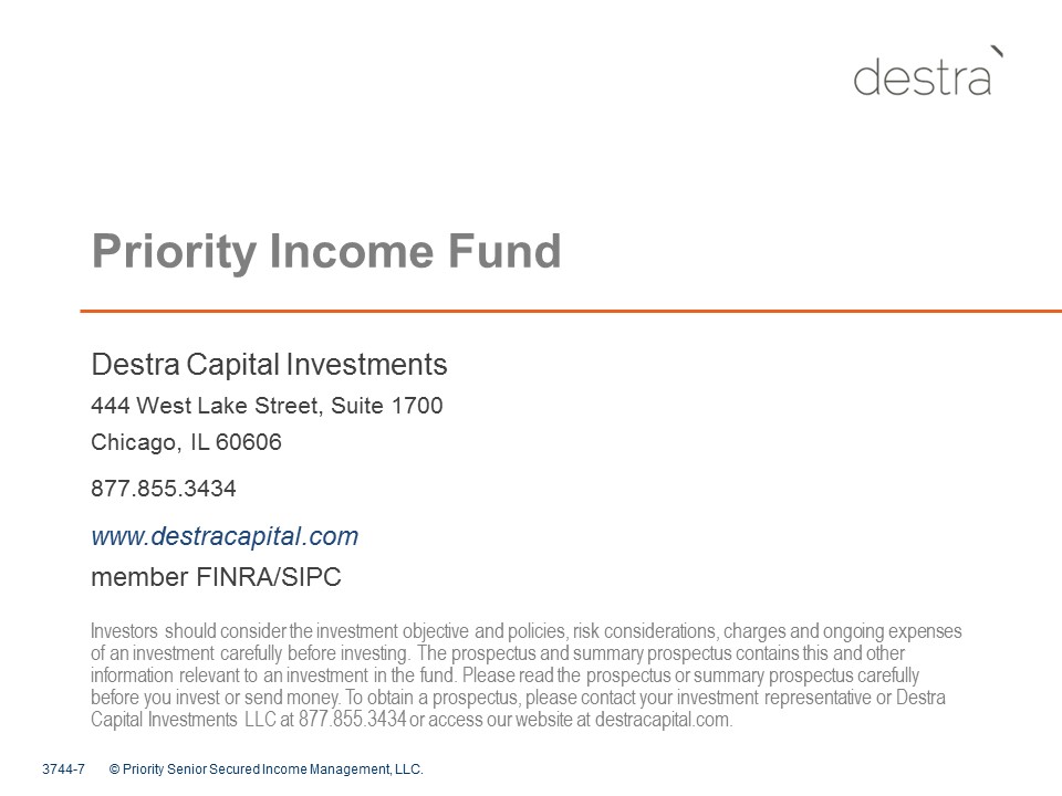 3744 - 7 © Priority Senior Secured Income Management, LLC. Destra Capital Investments 444 West Lake Street, Suite 1700 Chicago, IL 60606 877.855.3434 www.destracapital.com member FINRA/SIPC Priority Income Fund Investors should consider the investment objective and policies, risk considerations, charges and ongoing expenses of an investment carefully before investing. The prospectus and summary prospectus contains this and other information relevant to an investment in the fund. Please read the prospectus or summary prospectus carefully before you invest or send money. To obtain a prospectus, please contact your investment representative or Destra Capital Investments LLC at 877.855.3434 or access our website at destracapital.com.