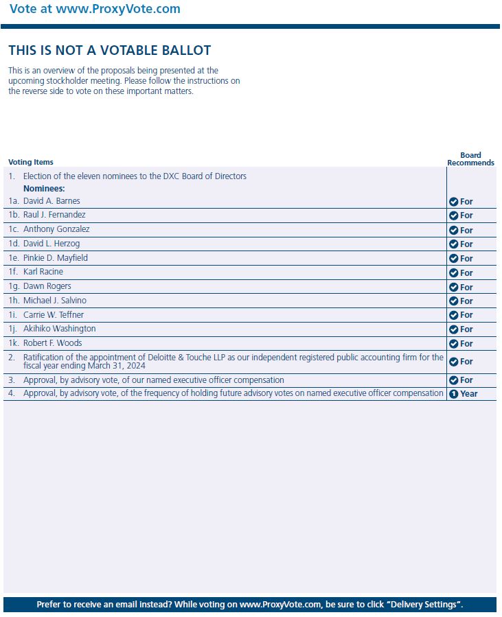 not otherwise receive a paper or email copy. Vote at the Virtual Meeting July 25, 2023 10:30 AM ET Virtually at: www.virtualshareholdermeeting.com/DXC2023 *You can also vote by mail or by telephone by requesting a paper copy of the