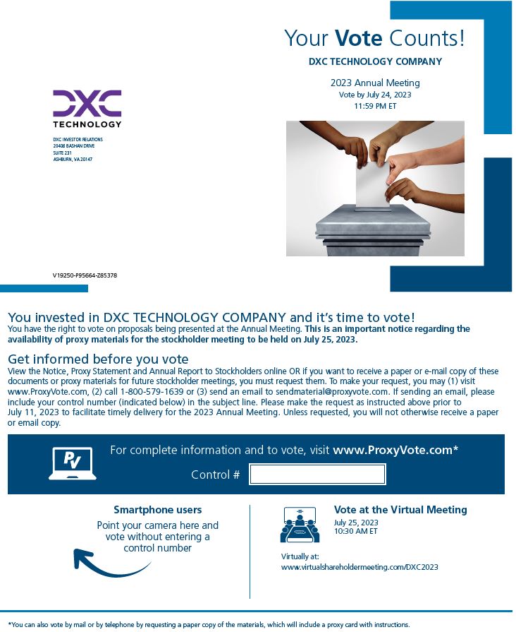 24, 2023 11:59 PM ET You invested in DXC TECHNOLOGY COMPANY and it’s time to vote! You have the right to vote on proposals being presented at the Annual Meeting. This is an important notice regarding the availability of proxy