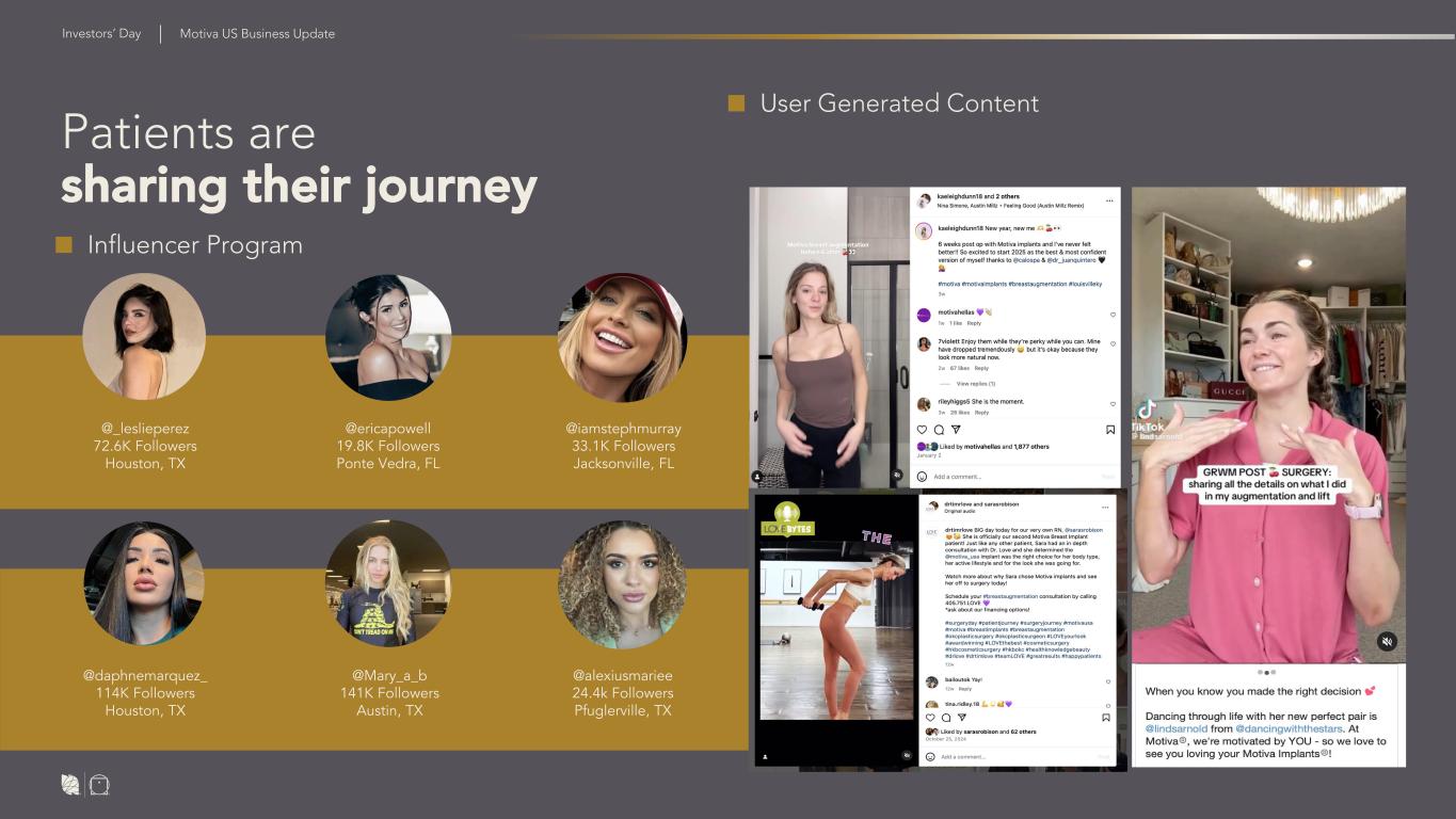 Motiva®’s first A-list celebrity influencer MEGHAN TRAINOR is a grammy award winning A- list singer songwriter and television personality, most notable for her debut single "All About That Bass”. Meghan has sold millions of albums worldwide and has over 18M social media followers. Meghan announced on her podcast in late November 2024 that she was ready for a breast augmentation. She shared that she’s been considering the procedure since the age of 16 and was finally ready after breastfeeding and losing weight. Motiva US Business UpdateInvestors’ Day