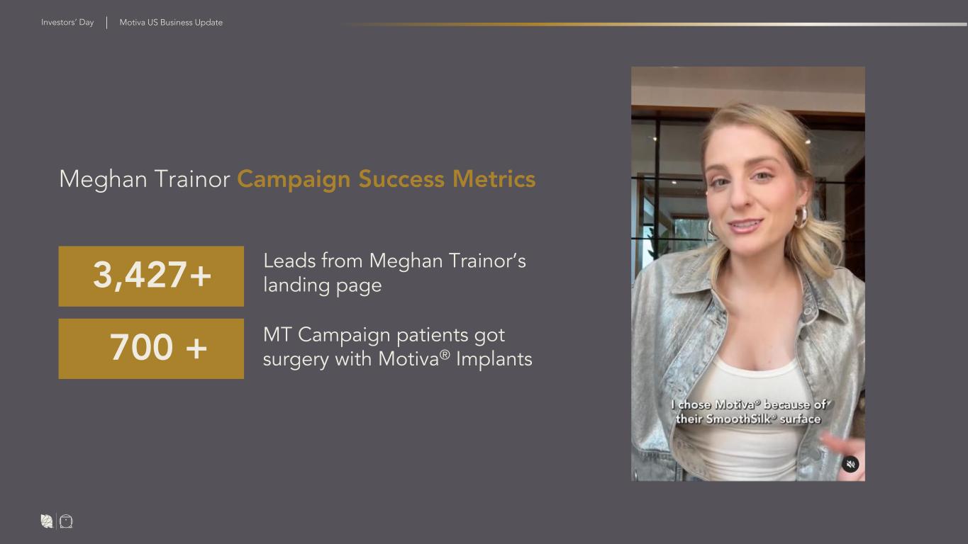 Meghan Trainor Campaign Success Metrics 3,427+ Leads from Meghan Trainor’s landing page MT Campaign patients got surgery with Motiva® Implants700 + Motiva US Business UpdateInvestors’ Day
