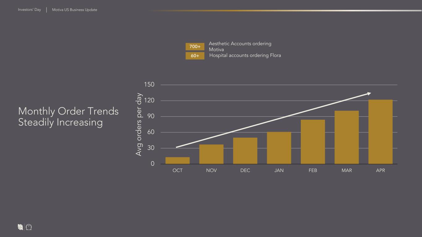 Monthly Order Trends Steadily Increasing 0 30 60 90 120 150 OCT NOV DEC JAN FEB MAR APR A vg o rd er s pe r d ay Hospital accounts ordering Flora 700+ 60+ Aesthetic Accounts ordering Motiva Investors’ Day Motiva US Business Update
