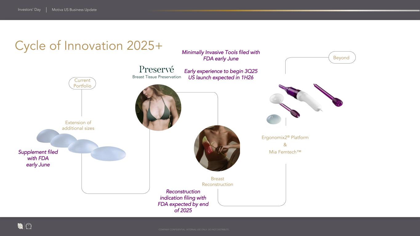 COMPANY CONFIDENTIAL. INTERNAL USE ONLY. DO NOT DISTRIBUTE. Investors’ Day Motiva US Business Update Extension of additional sizes Breast Tissue Preservation Current Portfolio Breast Reconstruction Beyond Ergonomix2® Platform & Mia Femtech Cycle of Innovation 2025+ Minimally Invasive Tools filed with FDA early June Early experience to begin 3Q25 US launch expected in 1H26 Supplement filed with FDA early June Reconstruction indication filing with FDA expected by end of 2025
