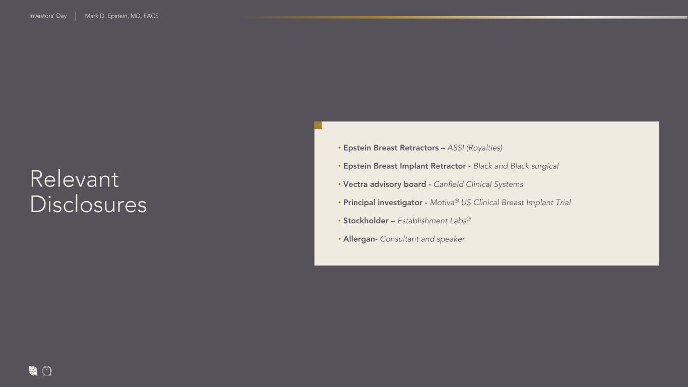 • Epstein Breast Retractors – ASSI (Royalties) • Epstein Breast Implant Retractor - Black and Black surgical • Vectra advisory board - Canfield Clinical Systems • Principal investigator - Motiva® US Clinical Breast Implant Trial • Stockholder – Establishment Labs® • Allergan- Consultant and speaker Relevant Disclosures Investors’ Day Mark D. Epstein, MD, FACS