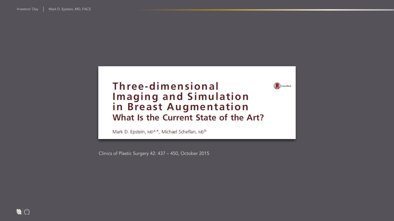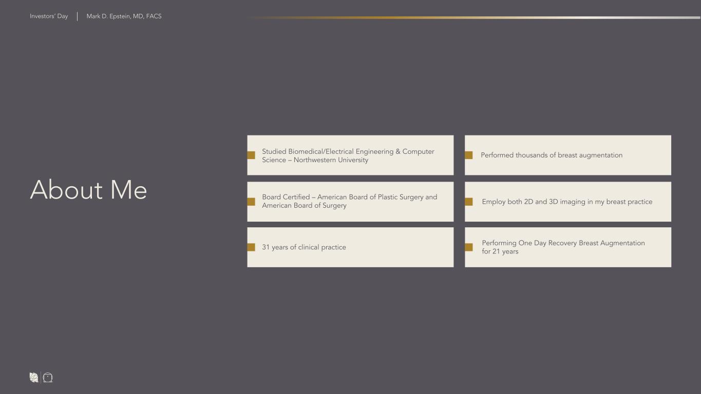 Studied Biomedical/Electrical Engineering & Computer Science – Northwestern University About Me Board Certified – American Board of Plastic Surgery and American Board of Surgery 31 years of clinical practice Performed thousands of breast augmentation Employ both 2D and 3D imaging in my breast practice Performing One Day Recovery Breast Augmentation for 21 years Investors’ Day Mark D. Epstein, MD, FACS