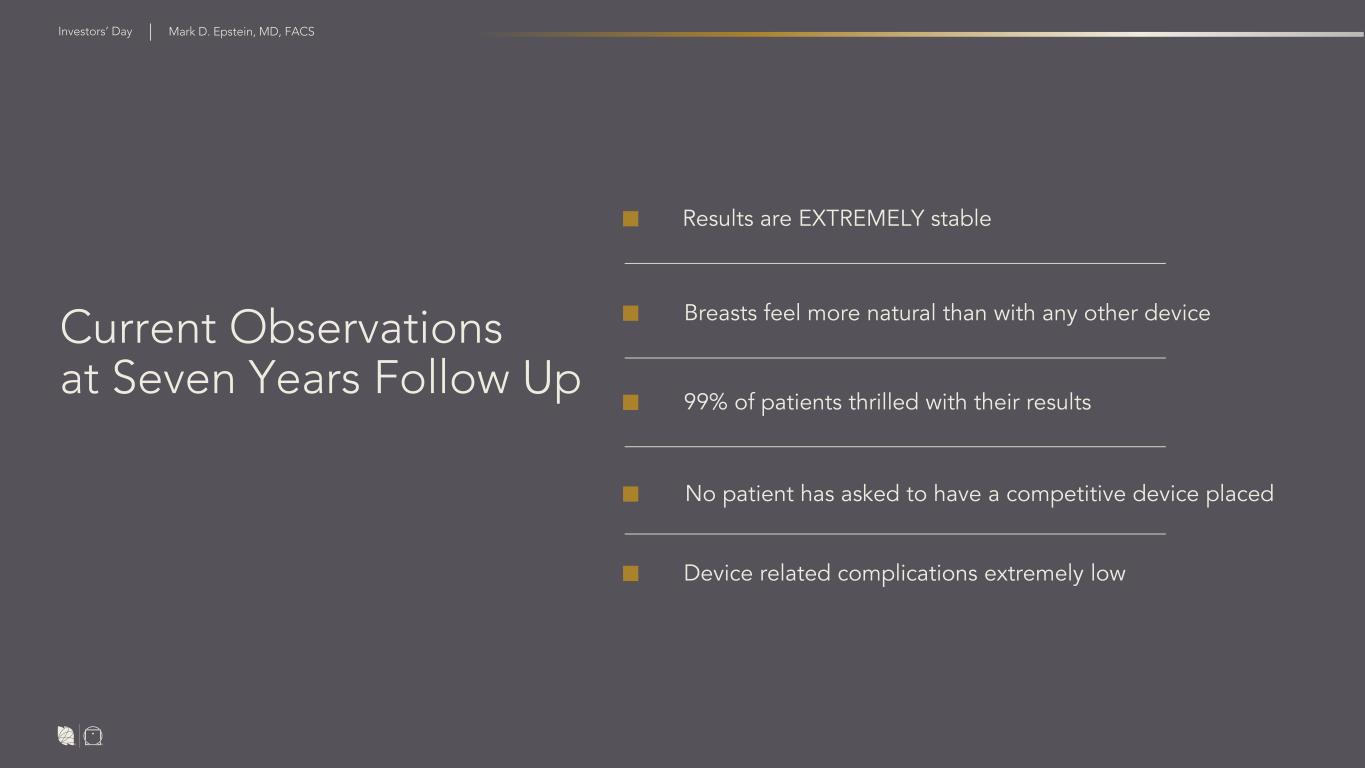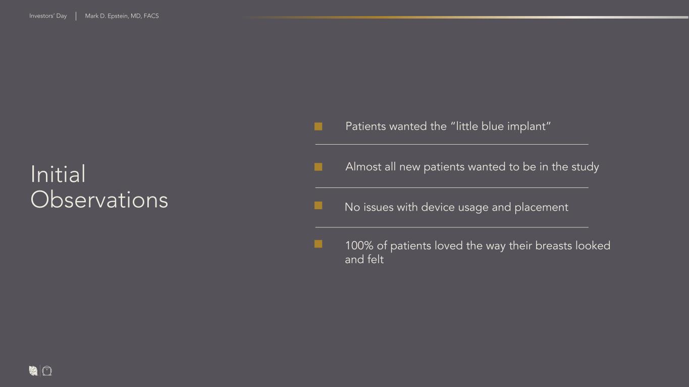Initial Observations Patients wanted the “little blue implant” Almost all new patients wanted to be in the study No issues with device usage and placement 100% of patients loved the way their breasts looked and felt Investors’ Day Mark D. Epstein, MD, FACS