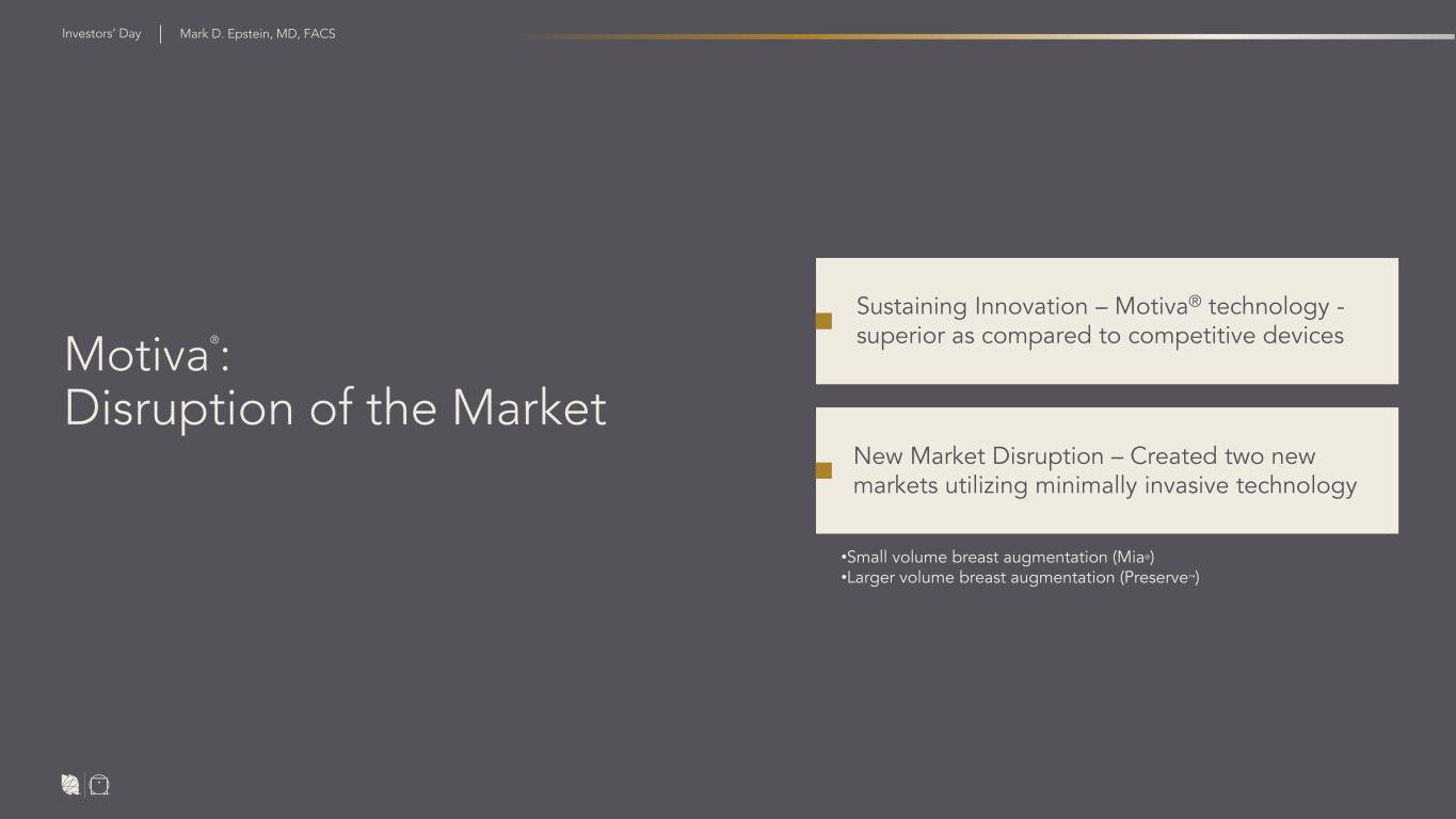 Sustaining Innovation – Motiva® technology - superior as compared to competitive devices New Market Disruption – Created two new markets utilizing minimally invasive technology •Small volume breast augmentation (Mia®) •Larger volume breast augmentation (Preserve ) Investors’ Day Motiva®: Disruption of the Market Mark D. Epstein, MD, FACS