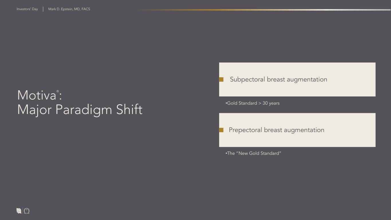 Subpectoral breast augmentation Prepectoral breast augmentation •The “New Gold Standard” •Gold Standard > 30 years Investors’ Day Motiva®: Major Paradigm Shift Mark D. Epstein, MD, FACS