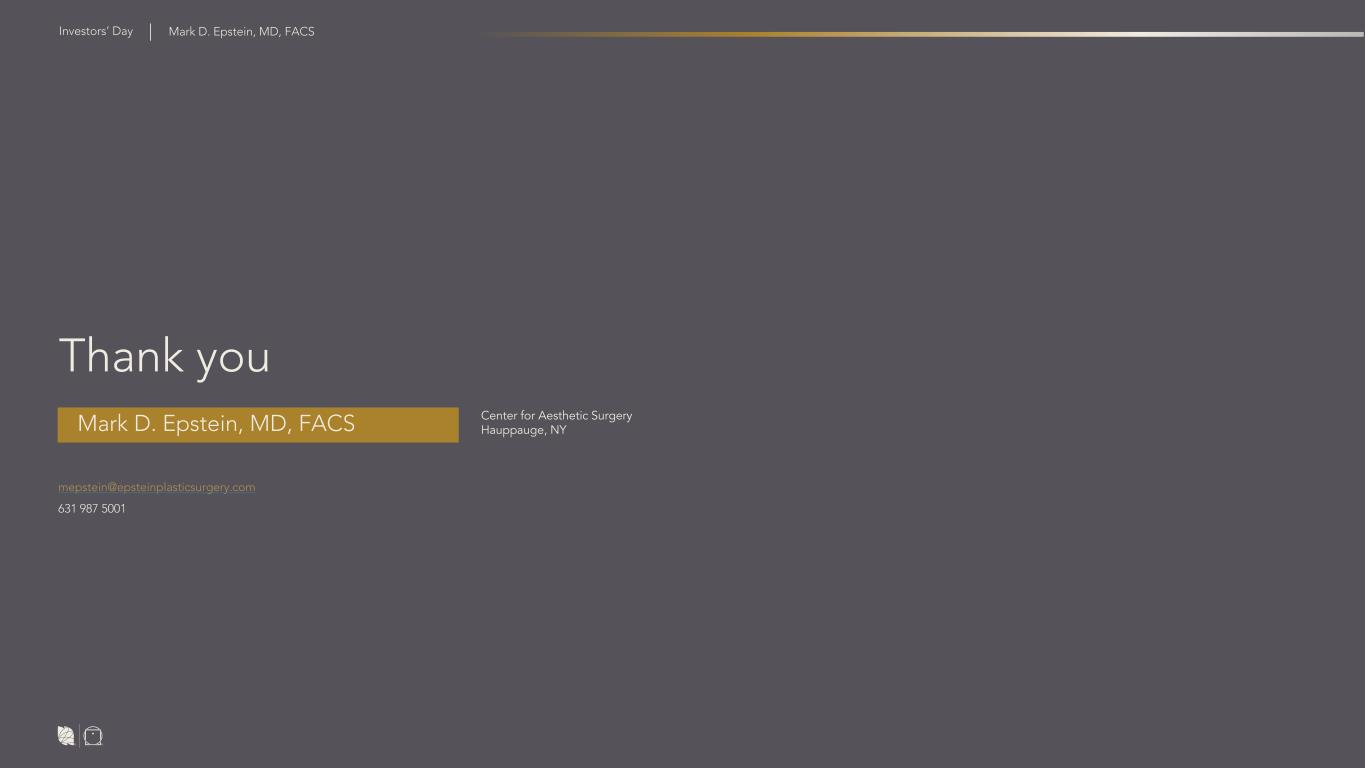 Thank you mepstein@epsteinplasticsurgery.com 631 987 5001 Center for Aesthetic Surgery Hauppauge, NYMark D. Epstein, MD, FACS Investors’ Day Mark D. Epstein, MD, FACS