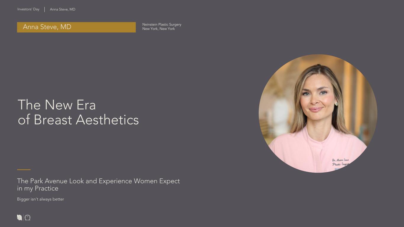 The New Era of Breast Aesthetics The Park Avenue Look and Experience Women Expect in my Practice Neinstein Plastic Surgery New York, New York Bigger isn't always better Anna Steve, MDInvestors’ Day Anna Steve, MD