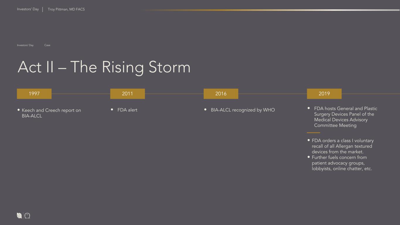CaseInvestors’ Day Act II – The Rising Storm 1997 • Keech and Creech report on BIA-ALCL 2011 • FDA alert 2016 • BIA-ALCL recognized by WHO 2019 • FDA hosts General and Plastic Surgery Devices Panel of the Medical Devices Advisory Committee Meeting • FDA orders a class I voluntary recall of all Allergan textured devices from the market. • Further fuels concern from patient advocacy groups, lobbyists, online chatter, etc. Investors’ Day Troy Pittman, MD FACS
