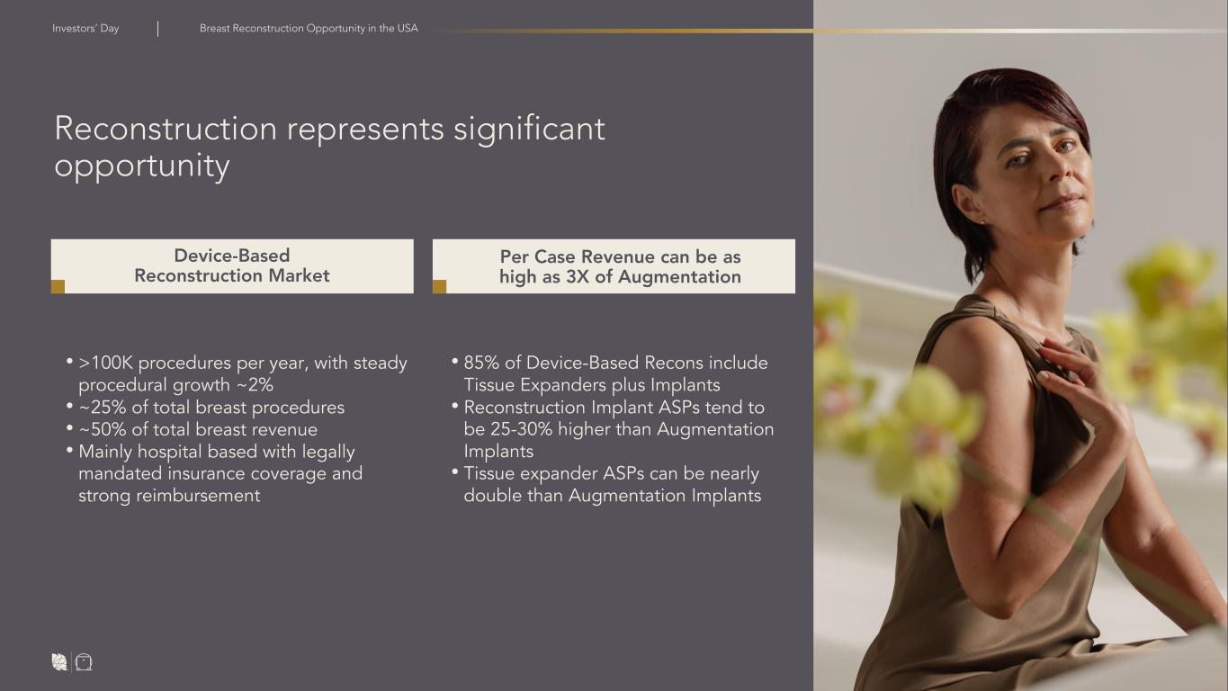 • 85% of Device-Based Recons include Tissue Expanders plus Implants • Reconstruction Implant ASPs tend to be 25-30% higher than Augmentation Implants • Tissue expander ASPs can be nearly double than Augmentation Implants Reconstruction represents significant opportunity Device-Based Reconstruction Market Per Case Revenue can be as high as 3X of Augmentation • >100K procedures per year, with steady procedural growth ~2% • ~25% of total breast procedures • ~50% of total breast revenue • Mainly hospital based with legally mandated insurance coverage and strong reimbursement Investors’ Day Breast Reconstruction Opportunity in the USA