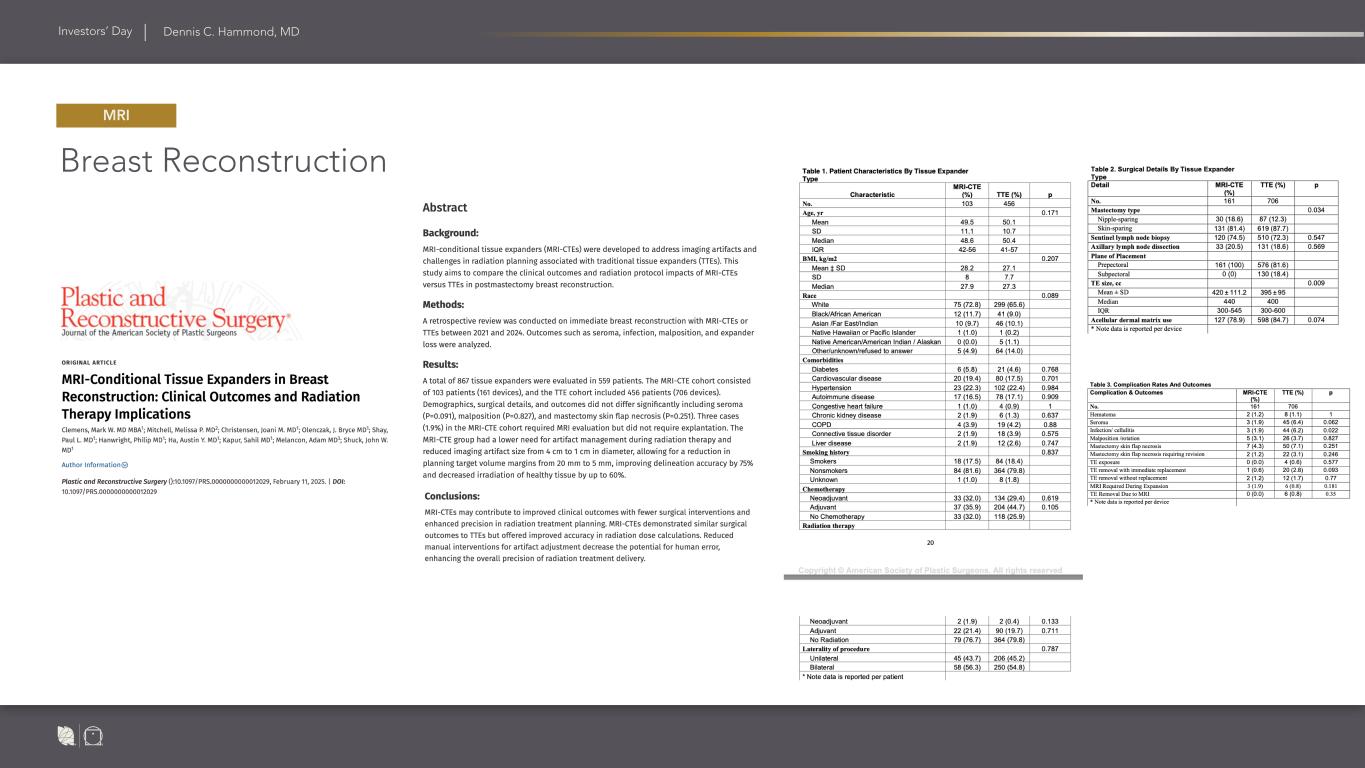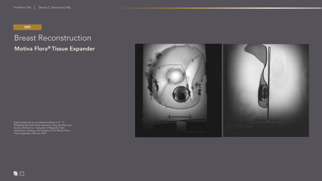 - Reconstruction Clemens MW, Mitchell MP, Christensen JM, et al. MRI-Conditional Tissue Expanders in Breast Reconstruction: Clinical Outcomes and Radiation Therapy Implications. Plast Reconstr Surg. Published online February 11, 2025. doi:10.1097/PRS.0000000000012029 Clinical Outcomes This retrospective, single center study explores and compares the clinical outcomes and radiation protocol impacts of MRI-Conditional Tissue Expanders (MRI-CTE’s) versus Traditional Tissue Expanders (TTE’s) in postmastectomy breast reconstruction. *Complications were tracked from expander placement to either exchange to a permanent implant or expander loss/removal. 867 tissue expanders patients559 456 706 tissue expanders 4.9 months mean follow-up 103 161 tissue expanders 4.7 months mean follow-up Complications* & Outcomes MRI-CTE (Motiva) (%) N=161 TTE (Mentor & Allergan) (%) N=706 Hematoma 2 (1.2%) 8 (1.1%) Seroma 3 (1.9%) 45 (6.4%) Infection/Cellulitis 3 (1.9%) 44 (6.2%) Malposition/Rotation 5 (3.1%) 26 (3.7%) Mastectomy Skin Flap Necrosis 7 (4.3%) 50 (7.1%) Mastectomy Skin Flap Necrosis Requiring Revision 2 (1.2%) 22 (3.1%) TE Exposure 0 (0%) 4 (0.6%) TE Removal with Immediate Replacement 1 (0.6%) 20 (2.8%) TE Removal without Replacement 2 (1.2%) 12 (1.7%) MRI Required During Expansion 3 (1.9%) 6 (0.8%) TE Removal Due to MRI 0 (0%) 6 (0.8%) patients Investors’ Day Dennis C. Hammond, MD