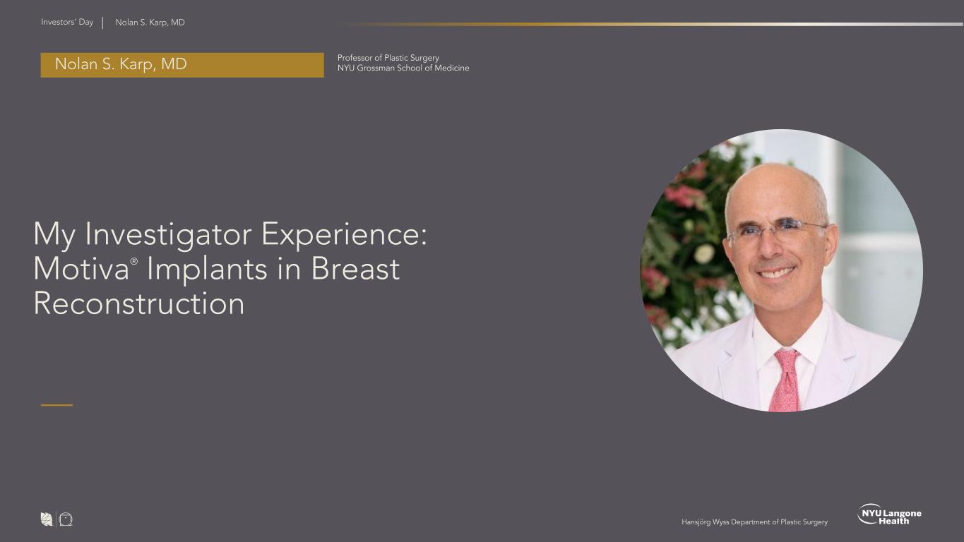 My Investigator Experience: Motiva® Implants in Breast Reconstruction Hansjörg Wyss Department of Plastic Surgery Professor of Plastic Surgery NYU Grossman School of MedicineNolan S. Karp, MD Investors’ Day Nolan S. Karp, MD