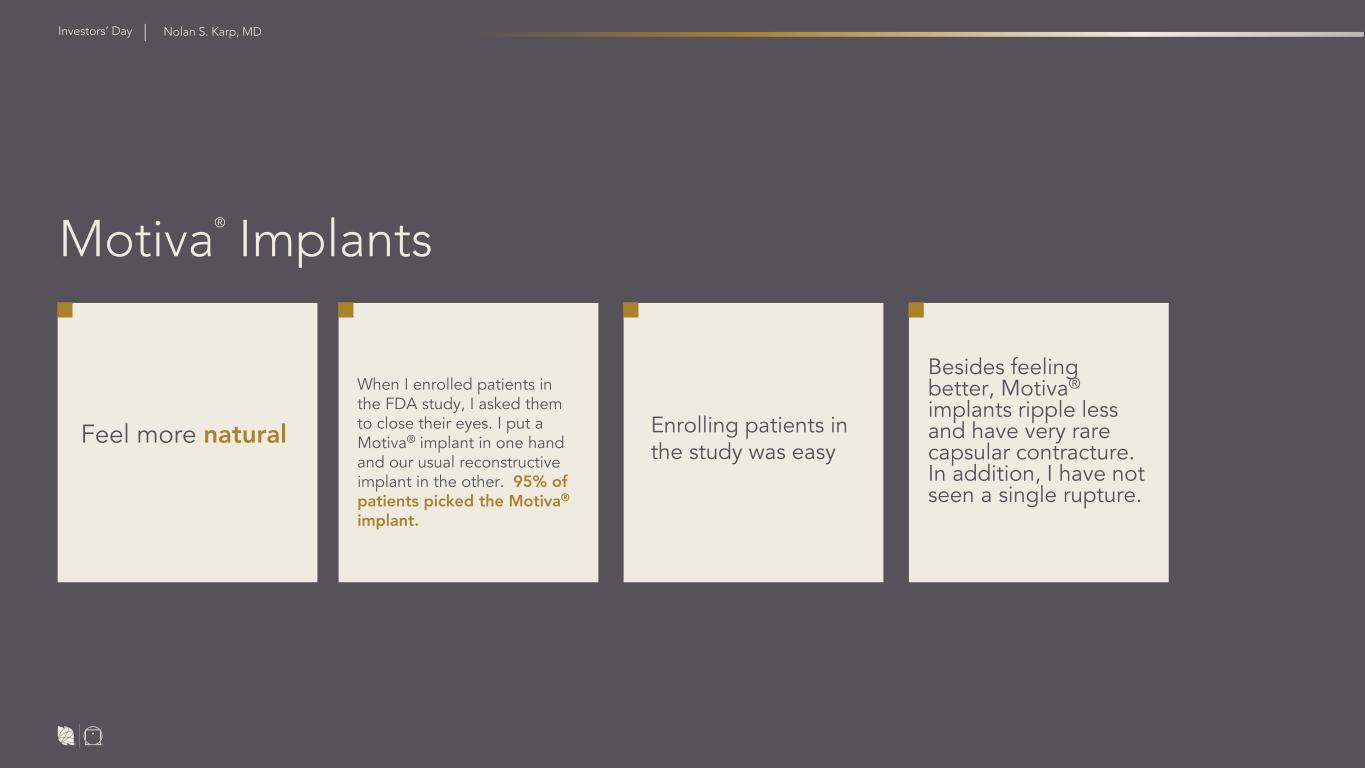 Motiva® Implants Feel more natural When I enrolled patients in the FDA study, I asked them to close their eyes. I put a Motiva® implant in one hand and our usual reconstructive implant in the other. 95% of patients picked the Motiva® implant. Enrolling patients in the study was easy Besides feeling better, Motiva® implants ripple less and have very rare capsular contracture. In addition, I have not seen a single rupture. Investors’ Day Nolan S. Karp, MD