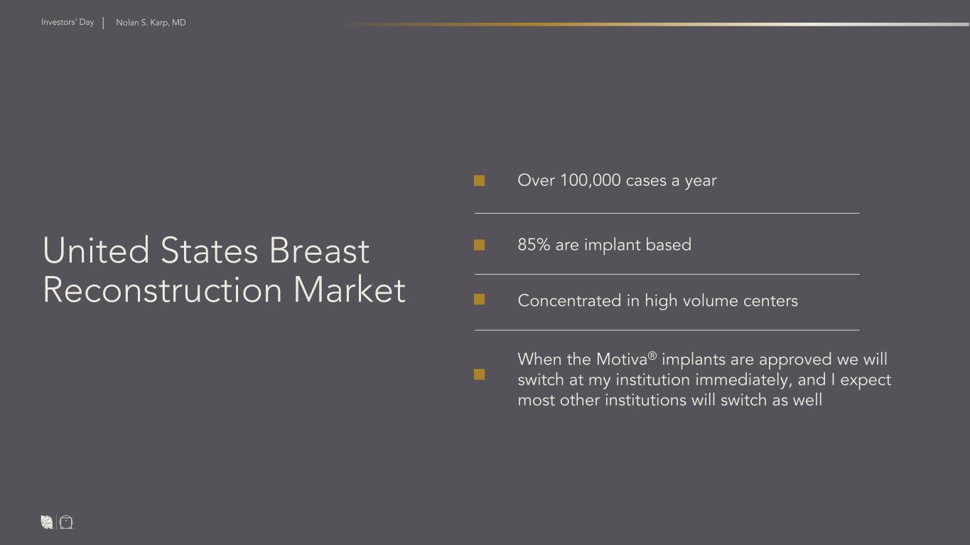 United States Breast Reconstruction Market Over 100,000 cases a year 85% are implant based Concentrated in high volume centers When the Motiva® implants are approved we will switch at my institution immediately, and I expect most other institutions will switch as well Investors’ Day Nolan S. Karp, MD
