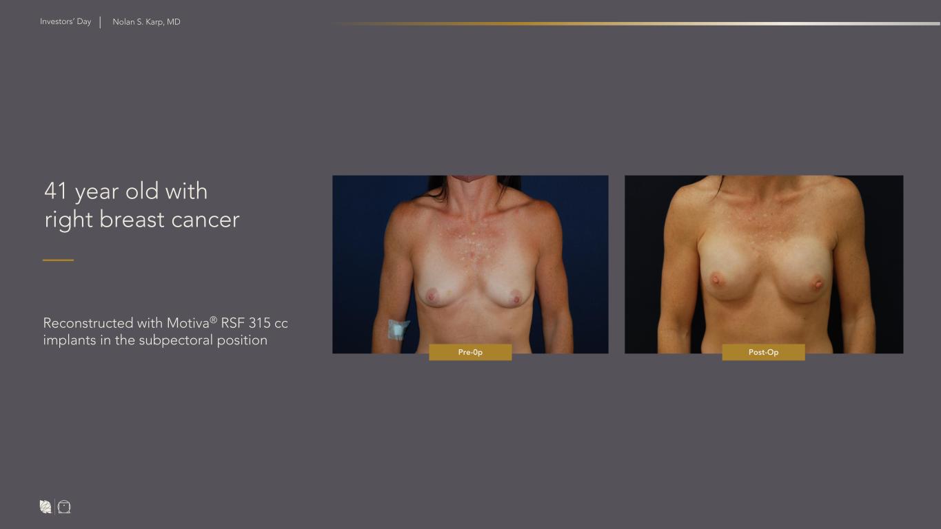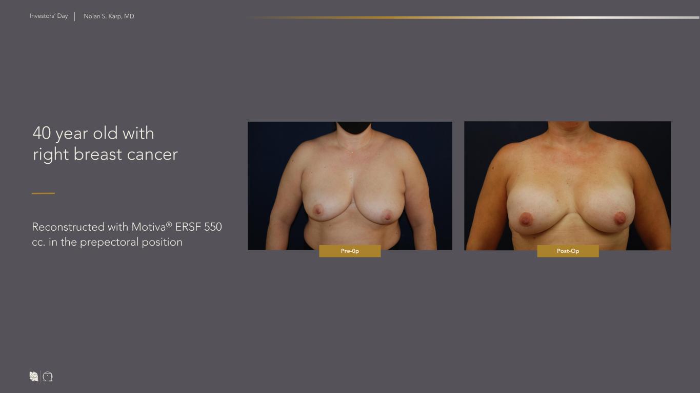 Post-OpPre-0p 40 year old with right breast cancer Reconstructed with Motiva® ERSF 550 cc. in the prepectoral position Investors’ Day Nolan S. Karp, MD