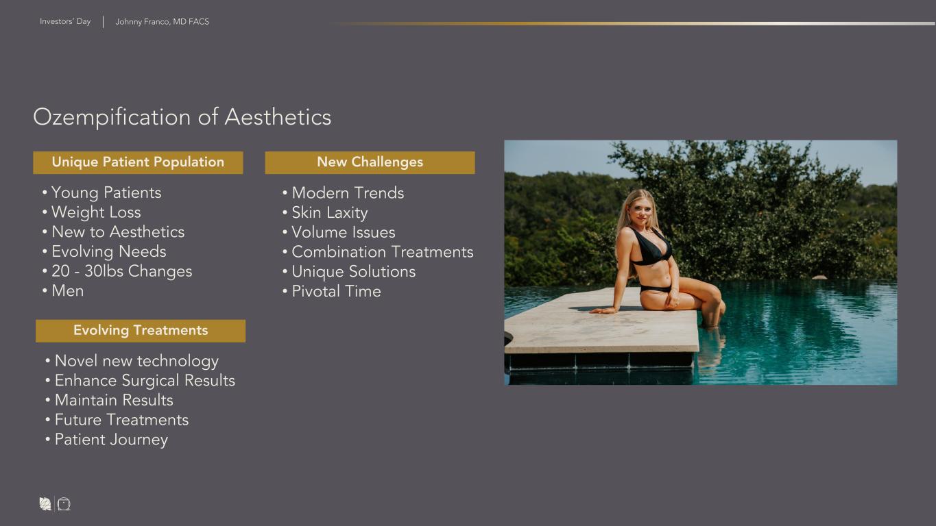 Ozempification of Aesthetics • Young Patients • Weight Loss • New to Aesthetics • Evolving Needs • 20 - 30lbs Changes • Men Unique Patient Population • Modern Trends • Skin Laxity • Volume Issues • Combination Treatments • Unique Solutions • Pivotal Time New Challenges • Novel new technology • Enhance Surgical Results • Maintain Results • Future Treatments • Patient Journey Evolving Treatments Johnny Franco, MD FACSInvestors’ Day