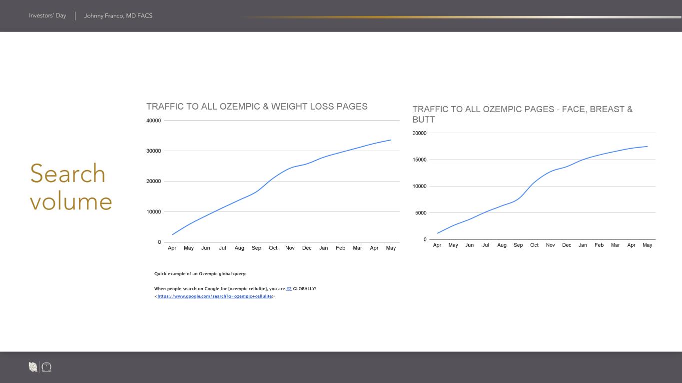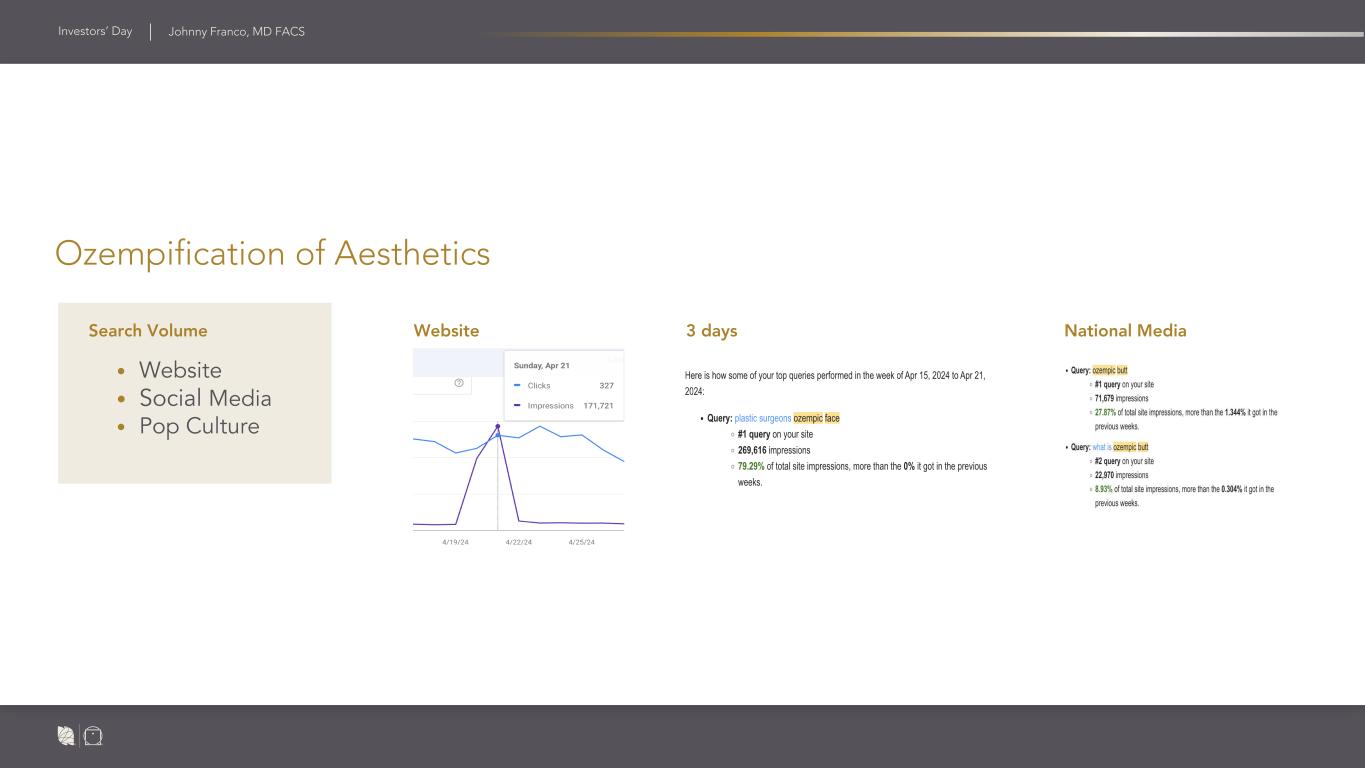 Ozempification of Aesthetics Website 3 days National Media • Website • Social Media • Pop Culture Search Volume Johnny Franco, MD FACSInvestors’ Day