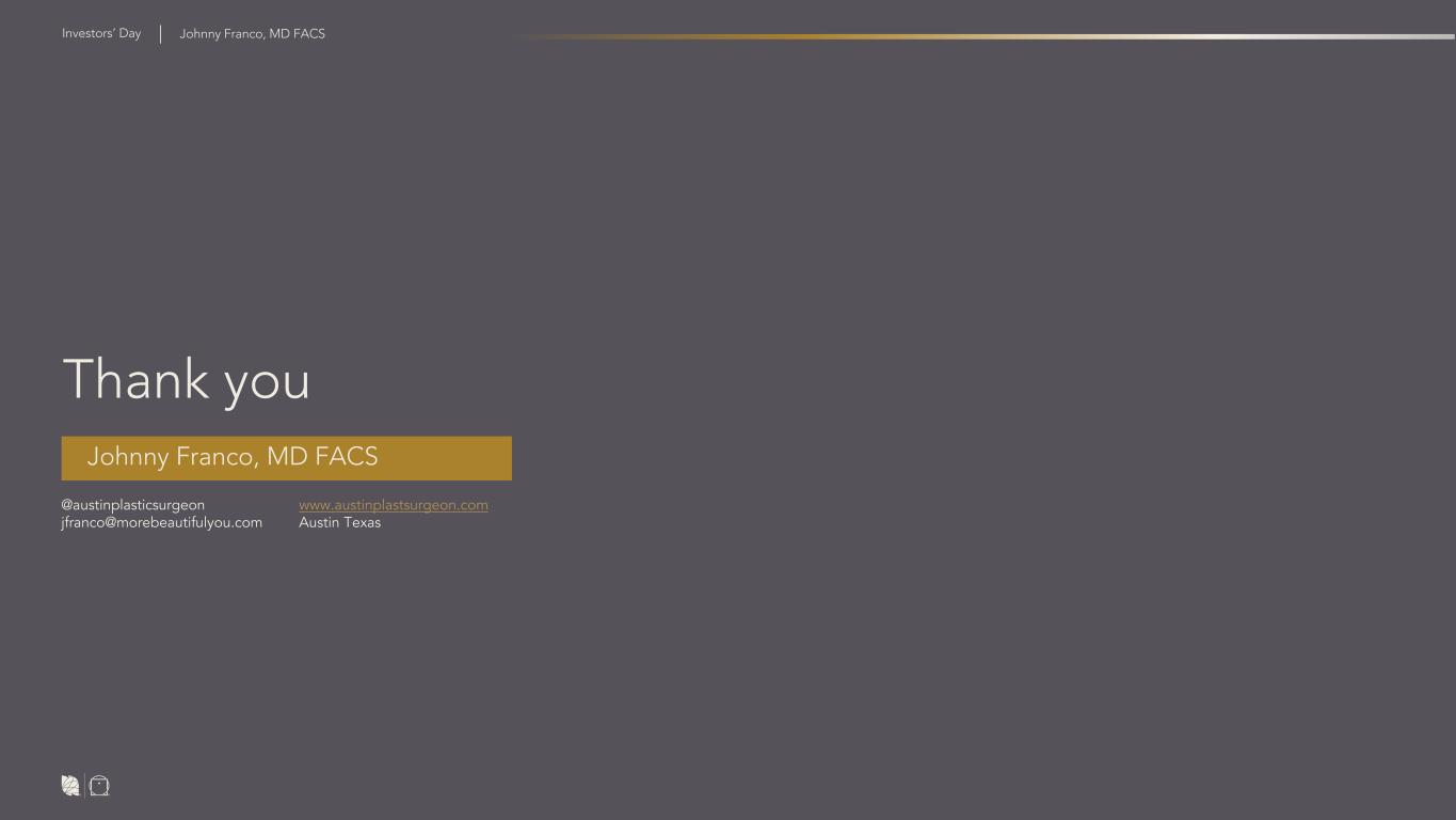 Thank you www.austinplastsurgeon.com Austin Texas @austinplasticsurgeon jfranco@morebeautifulyou.com Johnny Franco, MD FACS Johnny Franco, MD FACSInvestors’ Day