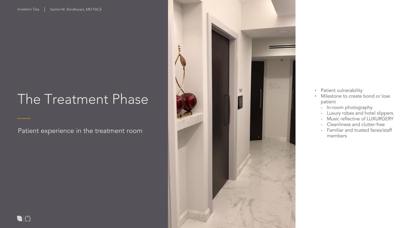 The Treatment Phase Patient experience in the treatment room • Patient vulnerability • Milestone to create bond or lose patient - In-room photography - Luxury robes and hotel slippers - Music reflective of LUXURGERY - Cleanliness and clutter-free - Familiar and trusted faces/staff members Sachin M. Shridharani, MD FACSInvestors’ Day
