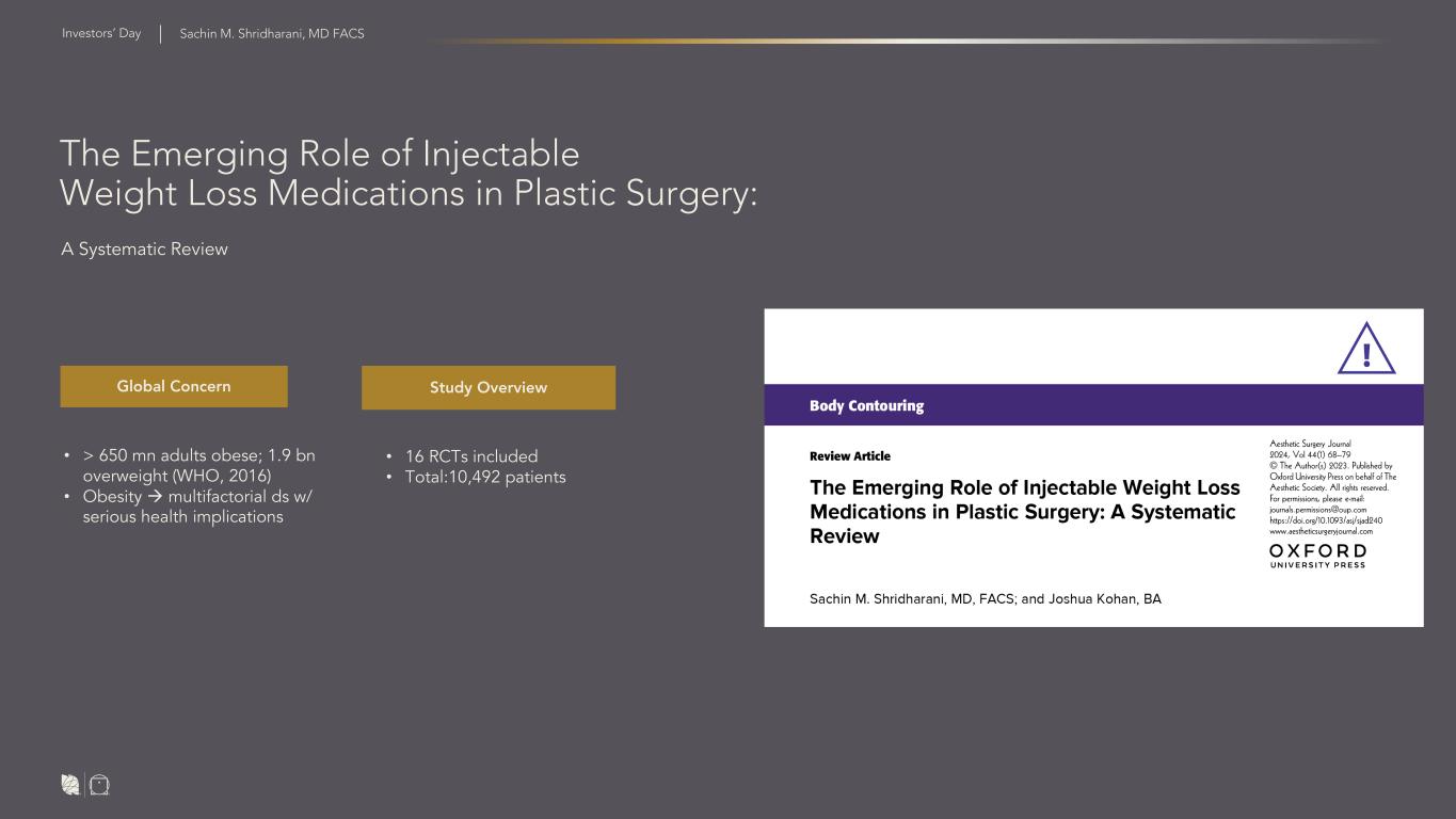 The Emerging Role of Injectable Weight Loss Medications in Plastic Surgery: A Systematic Review • 16 RCTs included • Total:10,492 patients Global Concern Study Overview • > 650 mn adults obese; 1.9 bn overweight (WHO, 2016) • Obesity → multifactorial ds w/ serious health implications Sachin M. Shridharani, MD FACSInvestors’ Day