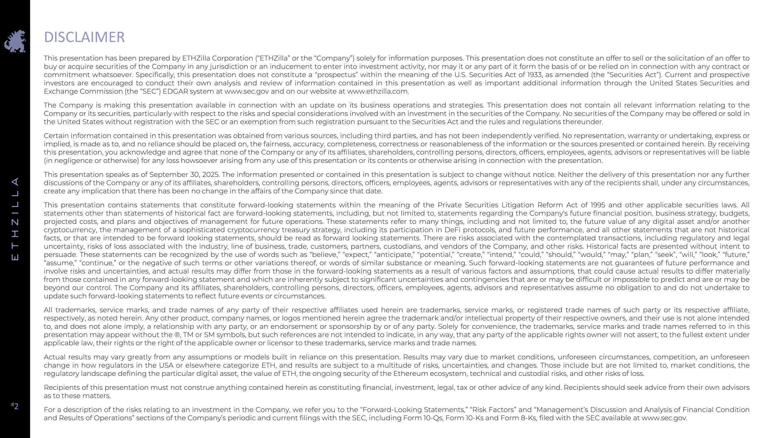 # 2 DISCLAIMER This presentation has been prepared by ETHZilla Corporation (“ ETHZilla ” or the “Company”) solely for information purposes . This presentation does not constitute an offer to sell or the solicitation of an offer to buy or acquire securities of the Company in any jurisdiction or an inducement to enter into investment activity, nor may it or any part of it form the basis of or be relied on in connection with any contract or commitment whatsoever . Specifically, this presentation does not constitute a “prospectus” within the meaning of the U . S . Securities Act of 1933 , as amended (the “Securities Act”) . Current and prospective investors are encouraged to conduct their own analysis and review of information contained in this presentation as well as important additional information through the United States Securities and Exchange Commission (the “SEC”) EDGAR system at www . sec . gov and on our website at www . ethzilla . com . The Company is making this presentation available in connection with an update on its business operations and strategies . This presentation does not contain all relevant information relating to the Company or its securities, particularly with respect to the risks and special considerations involved with an investment in the securities of the Company . No securities of the Company may be offered or sold in the United States without registration with the SEC or an exemption from such registration pursuant to the Securities Act and the rules and regulations thereunder . Certain information contained in this presentation was obtained from various sources, including third parties, and has not been independently verified . No representation, warranty or undertaking, express or implied, is made as to, and no reliance should be placed on, the fairness, accuracy, completeness, correctness or reasonableness of the information or the sources presented or contained herein . By receiving this presentation, you acknowledge and agree that none of the Company or any of its affiliates, shareholders, controlling persons, directors, officers, employees, agents, advisors or representatives will be liable (in negligence or otherwise) for any loss howsoever arising from any use of this presentation or its contents or otherwise arising in connection with the presentation . This presentation speaks as of September 30 , 2025 . The information presented or contained in this presentation is subject to change without notice . Neither the delivery of this presentation nor any further discussions of the Company or any of its affiliates, shareholders, controlling persons, directors, officers, employees, agents, advisors or representatives with any of the recipients shall, under any circumstances, create any implication that there has been no change in the affairs of the Company since that date . This presentation contains statements that constitute forward - looking statements within the meaning of the Private Securities Litigation Reform Act of 1995 and other applicable securities laws . All statements other than statements of historical fact are forward - looking statements, including, but not limited to, statements regarding the Company's future financial position, business strategy, budgets, projected costs, and plans and objectives of management for future operations . These statements refer to many things, including and not limited to, the future value of any digital asset and/or another cryptocurrency, the management of a sophisticated cryptocurrency treasury strategy, including its participation in DeFi protocols, and future performance, and all other statements that are not historical facts, or that are intended to be forward looking statements, should be read as forward looking statements . There are risks associated with the contemplated transactions, including regulatory and legal uncertainty, risks of loss associated with the industry, line of business, trade, customers, partners, custodians, and vendors of the Company, and other risks . Historical facts are presented without intent to persuade . These statements can be recognized by the use of words such as “believe,” “expect,” “anticipate,” “potential,” “create,” “intend,” “could,” “should,” “would,” “may,” “plan,” “seek”, “will,” “look,” “future,” “assume,” “continue,” or the negative of such terms or other variations thereof, or words of similar substance or meaning . Such forward - looking statements are not guarantees of future performance and involve risks and uncertainties, and actual results may differ from those in the forward - looking statements as a result of various factors and assumptions, that could cause actual results to differ materially from those contained in any forward - looking statement and which are inherently subject to significant uncertainties and contingencies that are or may be difficult or impossible to predict and are or may be beyond our control . The Company and its affiliates, shareholders, controlling persons, directors, officers, employees, agents, advisors and representatives assume no obligation to and do not undertake to update such forward - looking statements to reflect future events or circumstances . All trademarks, service marks, and trade names of any party of their respective affiliates used herein are trademarks, service marks, or registered trade names of such party or its respective affiliate, respectively, as noted herein . Any other product, company names, or logos mentioned herein agree the trademark and/or intellectual property of their respective owners, and their use is not alone intended to, and does not alone imply, a relationship with any party, or an endorsement or sponsorship by or of any party . Solely for convenience, the trademarks, service marks and trade names referred to in this presentation may appear without the ®, TM or SM symbols, but such references are no