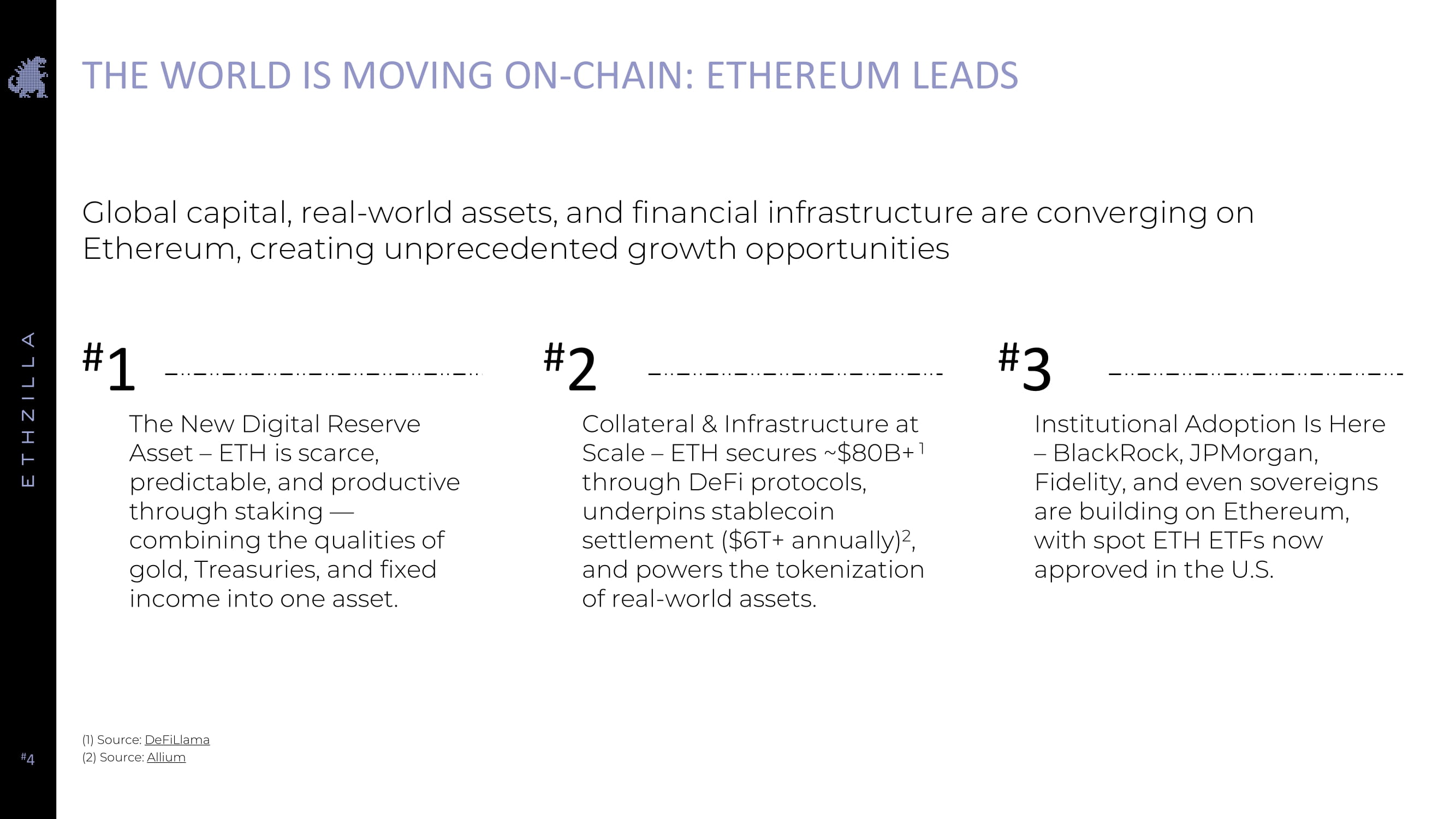# 4 THE WORLD IS MOVING ON - CHAIN: ETHEREUM LEADS The New Digital Reserve Asset – ETH is scarce, predictable, and productive through staking — combining the qualities of gold, Treasuries, and fixed income into one asset. Collateral & Infrastructure at Scale – ETH secures ~$80B+ 1 through DeFi protocols, underpins stablecoin settlement ($6T+ annually) 2 , and powers the tokenization of real - world assets. Institutional Adoption Is Here – BlackRock, JPMorgan, Fidelity, and even sovereigns are building on Ethereum, with spot ETH ETFs now approved in the U.S. Global capital, real - world assets, and financial infrastructure are converging on Ethereum, creating unprecedented growth opportunities (1) Source: DeFiLlama (2) Source: Allium # 1 # 2 # 3