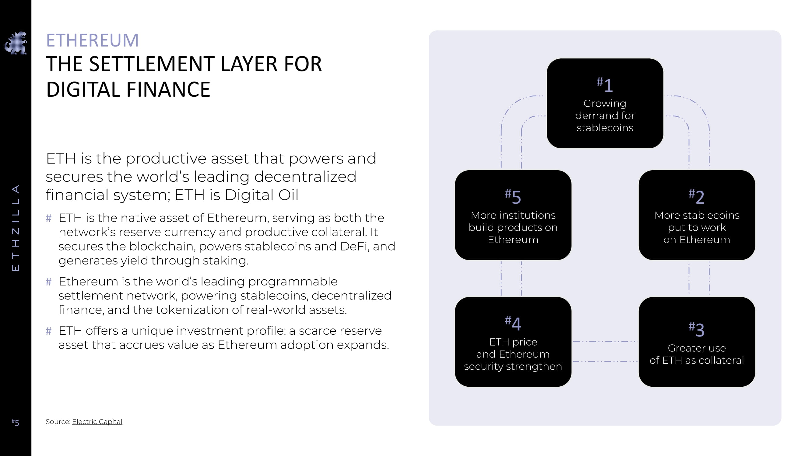 # 5 ETHEREUM THE SETTLEMENT LAYER FOR DIGITAL FINANCE ETH is the productive asset that powers and secures the world’s leading decentralized financial system; ETH is Digital Oil # ETH is the native asset of Ethereum, serving as both the network’s reserve currency and productive collateral. It secures the blockchain, powers stablecoins and DeFi, and generates yield through staking. # Ethereum is the world’s leading programmable settlement network, powering stablecoins, decentralized finance, and the tokenization of real - world assets. # ETH offers a unique investment profile: a scarce reserve asset that accrues value as Ethereum adoption expands. # 1 Growing demand for stablecoins # 3 Greater use of ETH as collateral # 2 More stablecoins put to work on Ethereum # 5 More institutions build products on Ethereum # 4 ETH price and Ethereum security strengthen Source: Electric Capital